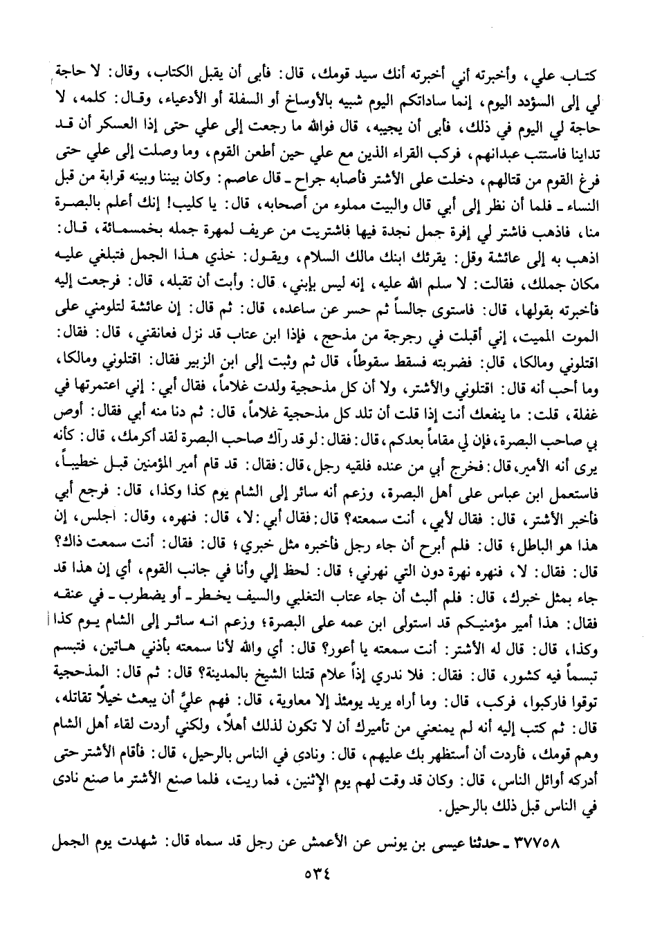 37758 - عِيسَى بْنُ يُونُسَ، عَنِ الْأَعْمَشِ، عَنْ رَجُلٍ، قَدْ سَمَّاهُ قَالَ: شَهِدْتُ يَوْمَ الْجَمَلِ فَمَا دَخَلْتُ دَارَ الْوَلِيدِ إِلَّا ذَكَرْتُ يَوْمَ الْجَمَلِ ; وَوَقْعَ السُّيُوفِ عَلَى الْبَيْضِ قَالَ: كُنْتُ §أَرَى عَلِيًّا يَحْمِلُ فَيَضْرِبُ بِسَيْفِهِ حَتَّى يَنْثَنِيَ ثُمَّ يَرْجِعُ فَيَقُولُ: لَا تَلُومُونِي , وَلُومُوا هَذَا , ثُمَّ يَعُودُ فَيُقَوِّمُهُ "