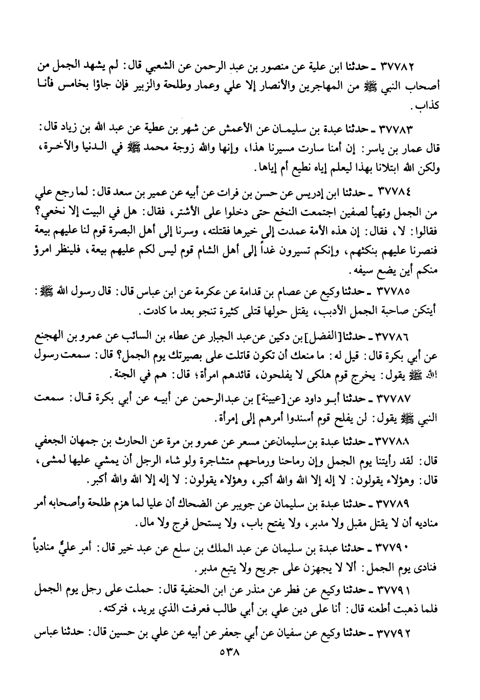 37793 - يَزِيدُ بْنُ هَارُونَ، قَالَ أَخْبَرَنَا أَبُو مَالِكٍ الْأَشْجَعِيُّ، عَنْ سَالِمِ بْنِ أَبِي الْجَعْدِ، عَنْ مُحَمَّدِ ابْنِ الْحَنَفِيَّةِ، قَالَ: §كُنَّا فِي الشِّعْبِ فَكُنَّا نَنْتَقِصُ عُثْمَانَ , فَلَمَّا كَانَ ذَاتَ يَوْمٍ أَفْرَطْنَا , فَالْتَفَتَ إِِلَيَّ عَبْدُ اللَّهِ بْنُ عَبَّاسٍ فَقُلْتُ لَهُ: يَا أَبَا عَبَّاسٍ , تَذْكُرُ عَشِيَّةَ الْجَمَلِ؟ أَنَا عَنْ يَمِينِ عَلِيٍّ وَأَنْتَ عَنْ شِمَالِهِ , إِِذْ سَمِعْنَا الصَّيْحَةَ مِنْ قِبَلِ الْمَدِينَةِ؟ قَالَ: فَقَالَ ابْنُ عَبَّاسٍ: نَعَمْ , الَّتِي بَعَثَ بِهَا فُلَانُ بْنُ فُلَانٍ , فَأَخْبَرَهُ أَنَّهُ وَجَدَ أُمَّ الْمُؤْمِنِينَ عَائِشَةَ وَاقِفَةً فِي الْمِرْبَدِ تَلْعَنُ قَتَلَةَ عُثْمَانَ , فَقَالَ عَلِيٌّ: لَعَنَ اللَّهُ قَتَلَةَ عُثْمَانَ فِي السَّهْلِ وَالْجَبَلِ وَالْبَرِّ وَالْبَحْرِ , أَنَا عَنْ يَمِينِ عَلِيٍّ وَهَذَا عَنْ شِمَالِهِ , فَسَمِعْتُهُ مِنْ فِيهِ إِِلَى فِي وَابْنُ عَبَّاسٍ , فَوَاللَّهِ مَا عِبْتُ عُثْمَانَ إِلَى يَوْمِي هَذَا "