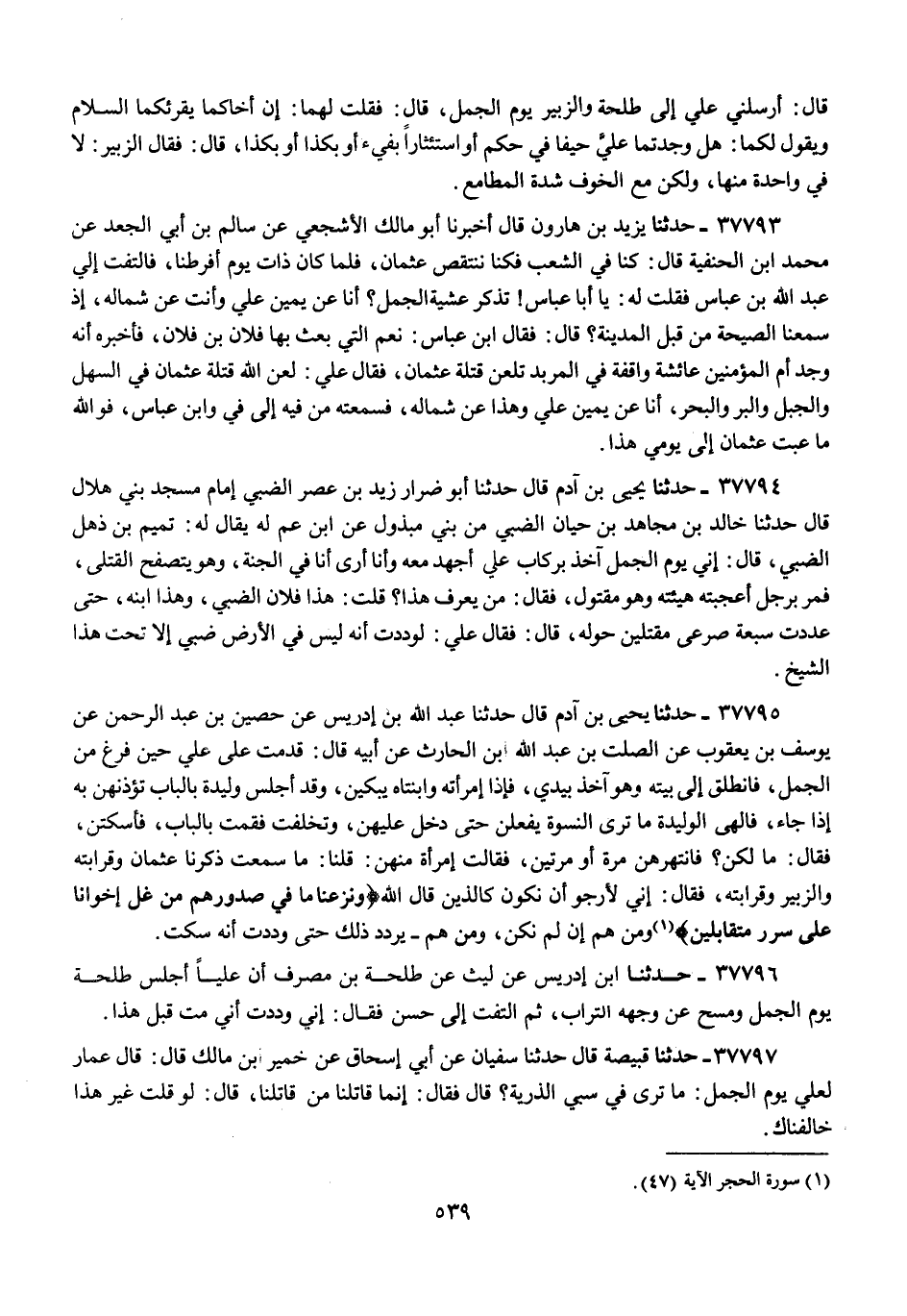 37795 - يَحْيَى بْنُ آدَمَ، قَالَ: حَدَّثَنَا عَبْدُ اللَّهِ بْنُ إِدْرِيسَ، عَنْ حُصَيْنِ بْنِ عَبْدِ الرَّحْمَنِ، عَنْ يُوسُفَ بْنِ يَعْقُوبَ، عَنِ الصَّلْتِ بْنِ عَبْدِ اللَّهِ بْنِ الْحَارِثِ، عَنْ أَبِيهِ، قَالَ: قَدِمْتُ عَلَى عَلِيٍّ حِينَ فَرَغَ مِنَ الْجَمَلِ , فَانْطَلَقَ إِلَى بَيْتِهِ وَهُوَ آخِذٌ بِيَدِي , فَإِذَا امْرَأَتُهُ وَابْنَتَاهُ يَبْكِينَ , وَقَدْ أَجْلَسْنَ وَلِيدَةً بِالْبَابِ تُؤْذِنُهُنَّ بِهِ إِذَا جَاءَ , فَأَلْهَى الْوَلِيدَةَ مَا تَرَى النِّسْوَةَ يَفْعَلْنَ حَتَّى دَخَلَ عَلَيْهِنَّ , وَتَخَلَّفْتُ فَقُمْتُ بِالْبَابِ , فَأُسْكِتْنَ , فَقَالَ: §مَا لَكُنَّ؟ فَانْتَهَرَهُنَّ مَرَّةً أَوْ مَرَّتَيْنِ , فَقَالَتِ امْرَأَةٌ مِنْهُنَّ: قُلْنَا: مَا سَمِعْتَ ذَكَرْنَا عُثْمَانَ وَقَرَابَتَهُ وَالزُّبَيْرَ وَقَرَابَتَهُ , فَقَالَ: إِنِّي لَأَرْجُو أَنْ نَكُونَ كَالَّذِينَ قَالَ اللَّهُ {وَنَزَعْنَا مَا فِي صُدُورِهِمْ مِنْ غِلٍّ إِخْوَانًا عَلَى سُرُرٍ مُتَقَابِلِينَ} [الحجر: 47] وَمَنْ هُمْ إِنْ لَمْ نَكُنْ؟ وَمَنْ هُمْ؟ يُرَدِّدُ ذَلِكَ حَتَّى وَدِدْتُ أَنَّهُ سَكَتَ "