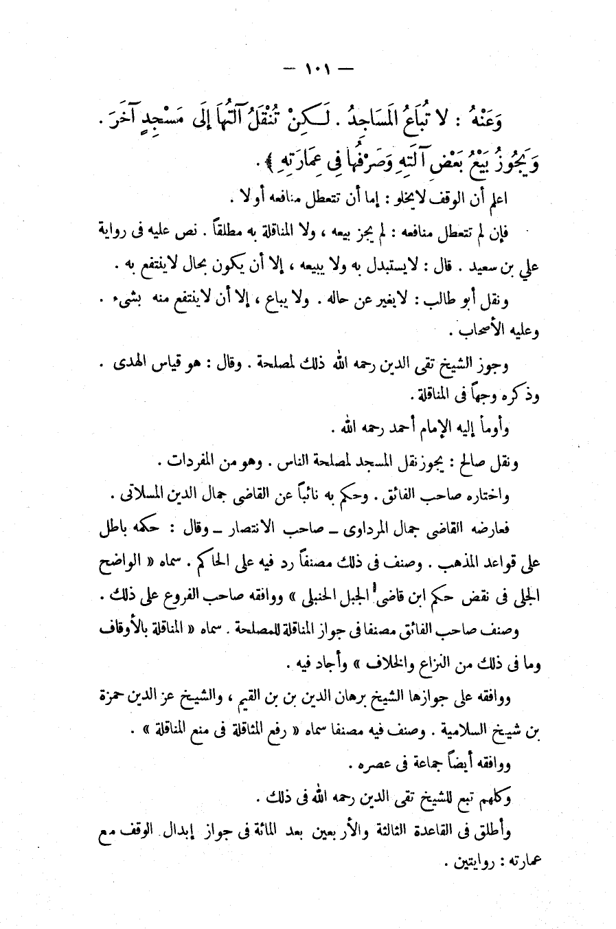 وَعَنْهُ: لَا يُبَاعُ الْمَسَاجِدُ. لَكِنْ تُنْقَلُ آلَتُهَا إلَى مَسْجِدٍ آخَرَ. وَيَجُوزُ بَيْعُ بَعْضِ آلَتِهِ وَصَرْفُهَا فِي عِمَارَتِهِ) . اعْلَمْ أَنَّ الْوَقْفَ لَا يَخْلُو: إمَّا أَنْ تَتَعَطَّلَ مَنَافِعُهُ أَوْ لَا. فَإِنْ لَمْ تَتَعَطَّلْ مَنَافِعُهُ: لَمْ يَجُزْ بَيْعُهُ، وَلَا الْمُنَاقَلَةُ بِهِ مُطْلَقًا. نَصَّ عَلَيْهِ فِي رِوَايَةِ عَلِيِّ بْنِ سَعِيدٍ. قَالَ: لَا يَسْتَبْدِلُ بِهِ وَلَا يَبِيعُهُ، إلَّا أَنْ يَكُونَ بِحَالٍ لَا يُنْتَفَعُ بِهِ. وَنَقَلَ أَبُو طَالِبٍ: لَا يُغَيَّرُ عَنْ حَالِهِ. وَلَا يُبَاعُ، إلَّا أَنْ لَا يُنْتَفَعَ مِنْهُ بِشَيْءٍ. وَعَلَيْهِ الْأَصْحَابُ. وَجَوَّزَ الشَّيْخُ تَقِيُّ الدِّينِ - رَحِمَهُ اللَّهُ - ذَلِكَ لِمَصْلَحَةٍ. وَقَالَ: هُوَ قِيَاسُ الْهَدْيِ. وَذَكَرَهُ وَجْهًا فِي الْمُنَاقَلَةِ. وَأَوْمَأَ إلَيْهِ الْإِمَامُ أَحْمَدُ - رَحِمَهُ اللَّهُ -. وَنَقَلَ صَالِحٌ: يَجُوزُ نَقْلُ الْمَسْجِدِ لِمَصْلَحَةِ النَّاسِ. وَهُوَ مِنْ الْمُفْرَدَاتِ. وَاخْتَارَهُ صَاحِبُ الْفَائِقِ. وَحَكَمَ بِهِ نَائِبًا عَنْ الْقَاضِي جَمَالِ الدِّينِ الْمُسْلَاتِيِّ. فَعَارَضَهُ الْقَاضِي جَمَالُ الْمِرْدَاوِيُّ صَاحِبُ الِانْتِصَارِ وَقَالَ: حُكْمُهُ بَاطِلٌ عَلَى قَوَاعِدِ الْمَذْهَبِ. وَصَنَّفَ فِي ذَلِكَ مُصَنَّفًا رَدَّ فِيهِ عَلَى الْحَاكِمِ. سَمَّاهُ " الْوَاضِحُ الْجَلِيُّ فِي نَقْضِ حُكْمِ ابْنِ قَاضِي الْجَبَلِ الْحَنْبَلِيِّ " وَوَافَقَهُ صَاحِبُ الْفُرُوعِ عَلَى ذَلِكَ. وَصَنَّفَ صَاحِبُ الْفَائِقِ مُصَنَّفًا فِي جَوَازِ الْمُنَاقَلَةِ لِلْمَصْلَحَةِ. سَمَّاهُ " الْمُنَاقَلَةُ بِالْأَوْقَافِ وَمَا فِي ذَلِكَ مِنْ النِّزَاعِ وَالْخِلَافِ " وَأَجَادَ فِيهِ. وَوَافَقَهُ عَلَى جَوَازِهَا الشَّيْخُ بُرْهَانُ الدِّينِ بْنُ الْقَيِّمِ، وَالشَّيْخُ عِزُّ الدِّينِ حَمْزَةُ بْنُ شَيْخِ السَّلَامِيَّةِ. وَصَنَّفَ فِيهِ مُصَنَّفًا سَمَّاهُ (رَفْعُ الْمُثَاقَلَةِ فِي مَنْعِ الْمُنَاقَلَةِ) . وَوَافَقَهُ أَيْضًا جَمَاعَةٌ فِي عَصْرِهِ. وَكُلُّهُمْ تَبَعٌ لِلشَّيْخِ تَقِيِّ الدِّينِ - رَحِمَهُ اللَّهُ - فِي ذَلِكَ. وَأَطْلَقَ فِي الْقَاعِدَةِ الثَّالِثَةِ وَالْأَرْبَعِينَ بَعْدَ الْمِائَةِ فِي جَوَازِ إبْدَالِ الْوَقْفِ مَعَ عِمَارَتِهِ: رِوَايَتَيْنِ.