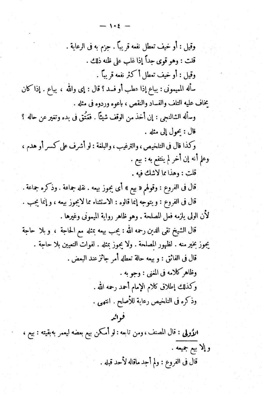 وَقِيلَ: أَوْ خِيفَ تَعَطُّلُ نَفْعِهِ قَرِيبًا. جَزَمَ بِهِ فِي الرِّعَايَةِ. قُلْت: وَهُوَ قَوِيٌّ جِدًّا إذَا غَلَبَ عَلَى ظَنِّهِ ذَلِكَ. وَقِيلَ: أَوْ خِيفَ تَعَطُّلُ أَكْثَرِ نَفْعِهِ قَرِيبًا. سَأَلَهُ الْمَيْمُونِيُّ: يُبَاعُ إذَا عَطِبَ أَوْ فَسَدَ؟ قَالَ: إي وَاَللَّهِ، يُبَاعُ. إذَا كَانَ يُخَافُ عَلَيْهِ التَّلَفُ وَالْفَسَادُ وَالنَّقْصُ، بَاعُوهُ وَرَدُّوهُ فِي مِثْلِهِ. وَسَأَلَهُ الشَّالَنْجِيُّ: إنْ أَخَذَ مِنْ الْوَقْفِ شَيْئًا. فَعَتَقَ فِي يَدِهِ وَتَغَيَّرَ عَنْ حَالِهِ؟ قَالَ: يُحَوَّلُ إلَى مِثْلِهِ. وَكَذَا قَالَ فِي التَّلْخِيصِ، وَالتَّرْغِيبِ، وَالْبُلْغَةِ: لَوْ أَشْرَفَ عَلَى كَسْرٍ أَوْ هَدْمٍ، وَعَلِمَ أَنَّهُ إنْ أُخِّرَ لَمْ يُنْتَفَعْ بِهِ: بِيعَ. قُلْت: وَهَذَا مِمَّا لَا شَكَّ فِيهِ. قَالَ فِي الْفُرُوعِ: وَقَوْلُهُمْ (بِيعَ) أَيْ يَجُوزُ بَيْعُهُ. نَقَلَهُ جَمَاعَةٌ. وَذَكَرَهُ جَمَاعَةٌ. قَالَ فِي الْفُرُوعِ: وَيَتَوَجَّهُ إنَّمَا قَالُوهُ: الِاسْتِثْنَاءُ مِمَّا لَا يَجُوزُ بَيْعُهُ، وَإِنَّمَا يَجِبُ. لِأَنَّ الْوَلِيَّ يَلْزَمُهُ فِعْلُ الْمَصْلَحَةِ. وَهُوَ ظَاهِرُ رِوَايَةِ الْمَيْمُونِيِّ وَغَيْرِهَا. قَالَ الشَّيْخُ تَقِيُّ الدِّينِ - رَحِمَهُ اللَّهُ -: يَجِبُ بَيْعُهُ بِمِثْلِهِ مَعَ الْحَاجَةِ، وَبِلَا حَاجَةٍ يَجُوزُ بِخَيْرٍ مِنْهُ. لِظُهُورِ الْمَصْلَحَةِ. وَلَا يَجُوزُ بِمِثْلِهِ. لِفَوَاتِ التَّعْيِينِ بِلَا حَاجَةٍ. قَالَ فِي الْفَائِقِ: وَبَيْعُهُ حَالَةَ تَعَطُّلِهِ أَمْرٌ جَائِزٌ عِنْدَ الْبَعْضِ. وَظَاهِرُ كَلَامِهِ فِي الْمُغْنِي: وُجُوبُهُ. وَكَذَلِكَ إطْلَاقُ كَلَامِ الْإِمَامِ أَحْمَدَ - رَحِمَهُ اللَّهُ -. وَذَكَرَهُ فِي التَّلْخِيصِ رِعَايَةً لِلْأَصْلَحِ انْتَهَى. فَوَائِدُ