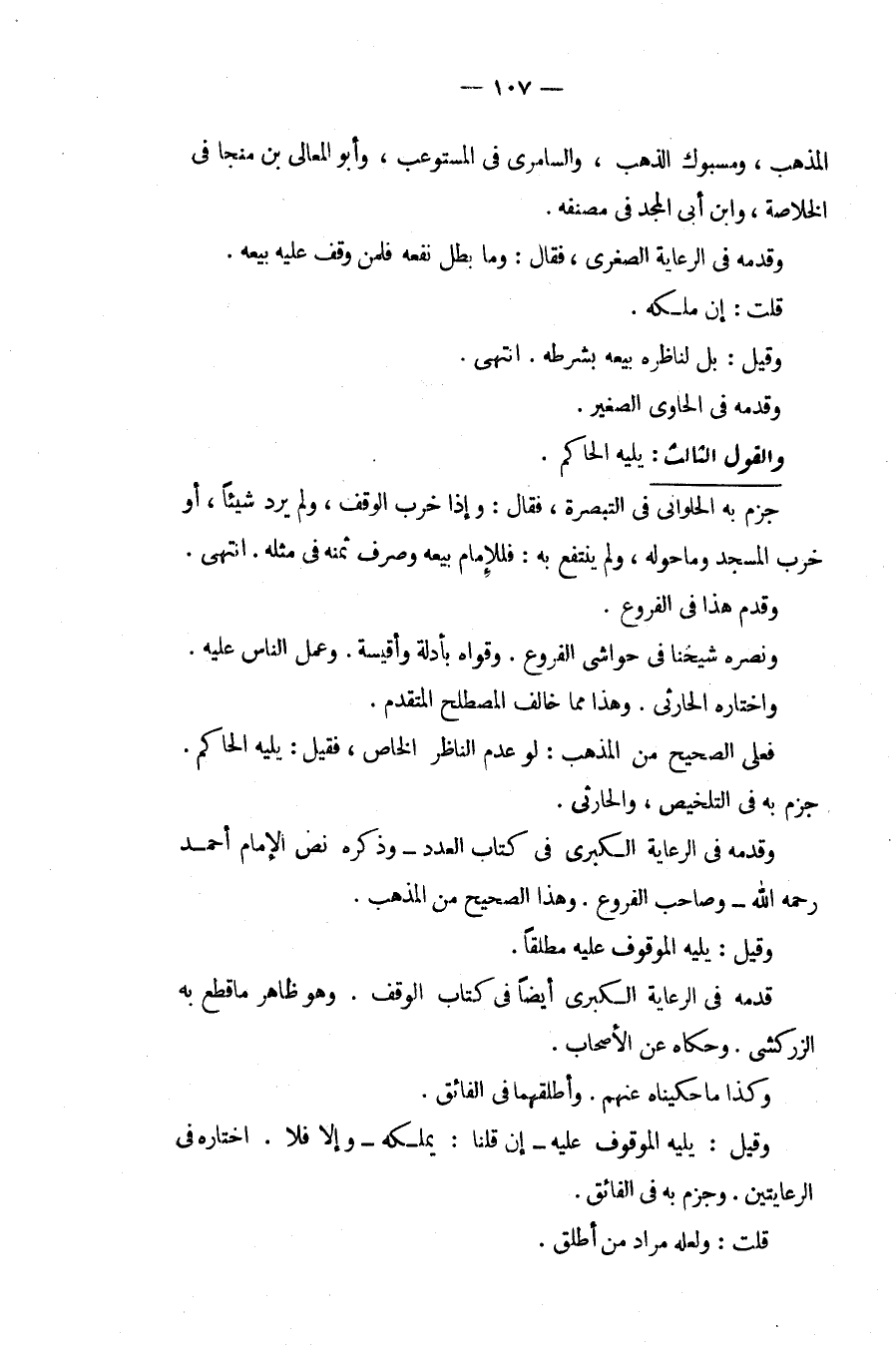 الْمُذْهَبِ، وَمَسْبُوكِ الذَّهَبِ، وَالسَّامِرِيُّ فِي الْمُسْتَوْعِبِ، وَأَبُو الْمَعَالِي بْنُ مُنَجَّا فِي الْخُلَاصَةِ، وَابْنُ أَبِي الْمَجْدِ فِي مُصَنَّفِهِ. وَقَدَّمَهُ فِي الرِّعَايَةِ الصُّغْرَى، فَقَالَ: وَمَا بَطَلَ نَفْعُهُ فَلِمَنْ وُقِفَ عَلَيْهِ بَيْعُهُ. قُلْت: إنْ مَلَكَهُ. وَقِيلَ: بَلْ لِنَاظِرِهِ بَيْعُهُ بِشَرْطِهِ. انْتَهَى. وَقَدَّمَهُ فِي الْحَاوِي الصَّغِيرِ.