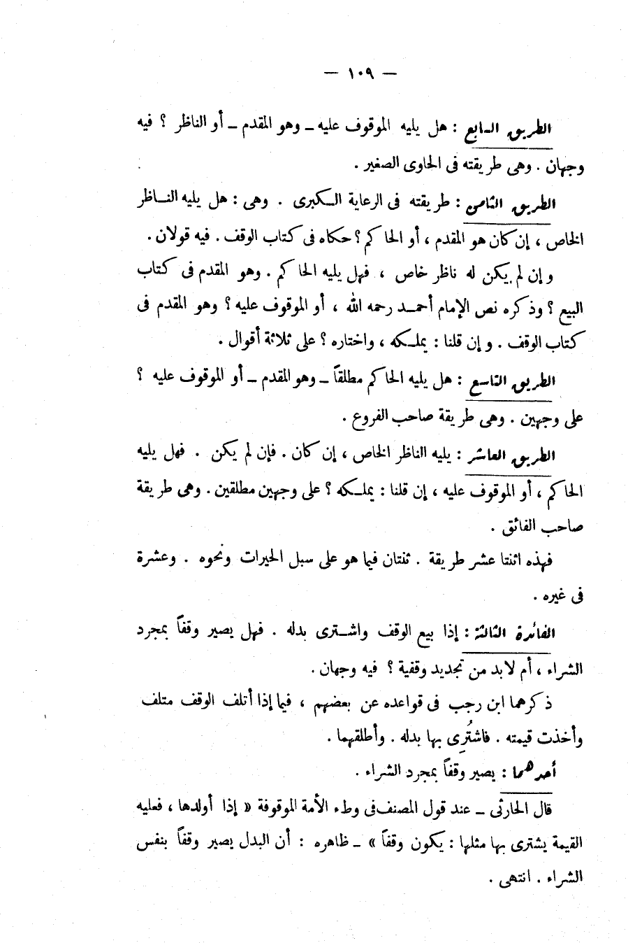 الطَّرِيقُ الْعَاشِرُ: يَلِيهِ النَّاظِرُ الْخَاصُّ، إنْ كَانَ. فَإِنْ لَمْ يَكُنْ. فَهَلْ يَلِيهِ الْحَاكِمُ، أَوْ الْمَوْقُوفُ عَلَيْهِ، إنْ قُلْنَا: يَمْلِكُهُ؟ عَلَى وَجْهَيْنِ مُطْلَقَيْنِ. وَهِيَ طَرِيقَةُ صَاحِبِ الْفَائِقِ. فَهَذِهِ اثْنَتَا عَشْرَةَ طَرِيقَةً. ثِنْتَانِ فِيمَا هُوَ عَلَى سُبُلِ الْخَيْرَاتِ وَنَحْوِهِ. وَعَشْرَةٌ فِي غَيْرِهِ. الْفَائِدَةُ الثَّالِثَةُ: إذَا بِيعَ الْوَقْفُ وَاشْتُرِيَ بَدَلُهُ. فَهَلْ يَصِيرُ وَقْفًا بِمُجَرَّدِ الشِّرَاءِ، أَمْ لَا بُدَّ مِنْ تَجْدِيدِ وَقْفِيَّةٍ؟ فِيهِ وَجْهَانِ. ذَكَرَهُمَا ابْنُ رَجَبٍ فِي قَوَاعِدِهِ عَنْ بَعْضِهِمْ، فِيمَا إذَا أَتْلَفَ الْوَقْفَ مُتْلِفٌ وَأُخِذَتْ قِيمَتُهُ. فَاشْتُرِيَ بِهَا بَدَلُهُ. وَأَطْلَقَهُمَا.