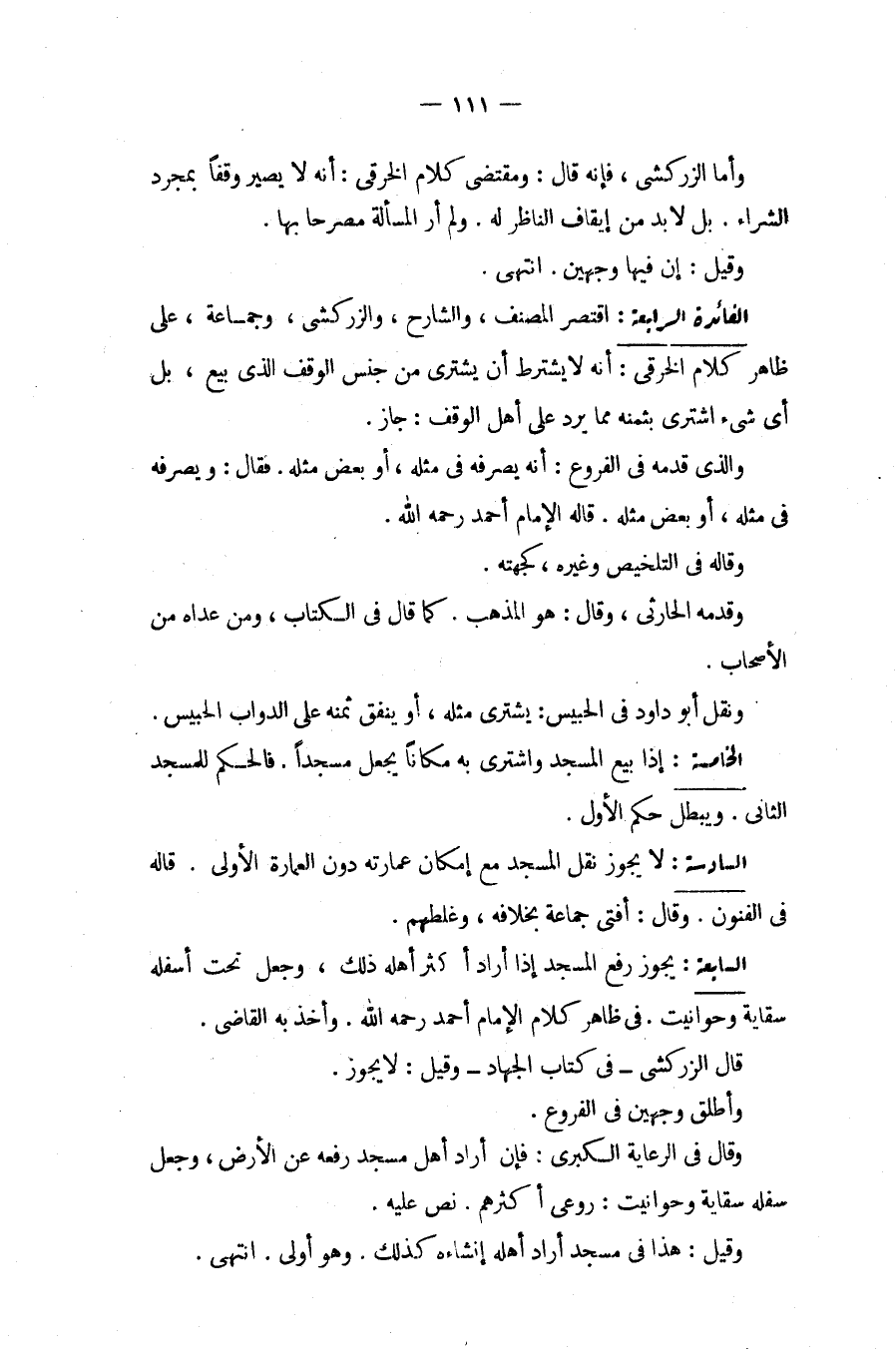 وَأَمَّا الزَّرْكَشِيُّ، فَإِنَّهُ قَالَ: وَمُقْتَضَى كَلَامِ الْخِرَقِيِّ: أَنَّهُ لَا يَصِيرُ وَقْفًا بِمُجَرَّدِ الشِّرَاءِ. بَلْ لَا بُدَّ مِنْ إيقَافِ النَّاظِرِ لَهُ. وَلَمْ أَرَ الْمَسْأَلَةَ مُصَرَّحًا بِهَا. وَقِيلَ: إنَّ فِيهَا وَجْهَيْنِ. انْتَهَى. الْفَائِدَةُ الرَّابِعَةُ: اقْتَصَرَ الْمُصَنِّفُ، وَالشَّارِحُ، وَالزَّرْكَشِيُّ، وَجَمَاعَةٌ، عَلَى ظَاهِرِ كَلَامِ الْخِرَقِيِّ: أَنَّهُ لَا يُشْتَرَطُ أَنْ يَشْتَرِيَ مِنْ جِنْسِ الْوَقْفِ الَّذِي بِيعَ، بَلْ أَيَّ شَيْءٍ اشْتَرَى بِثَمَنِهِ مِمَّا يُرَدُّ عَلَى أَهْلِ الْوَقْفِ: جَازَ. وَاَلَّذِي قَدَّمَهُ فِي الْفُرُوعِ: أَنَّهُ يَصْرِفُهُ فِي مِثْلِهِ، أَوْ بَعْضِ مِثْلِهِ. فَقَالَ: وَيَصْرِفُهُ فِي مِثْلِهِ، أَوْ بَعْضِ مِثْلِهِ. قَالَهُ الْإِمَامُ أَحْمَدُ - رَحِمَهُ اللَّهُ -. وَقَالَهُ فِي التَّلْخِيصِ وَغَيْرِهِ، كَجِهَتِهِ. وَقَدَّمَهُ الْحَارِثِيُّ، وَقَالَ: هُوَ الْمَذْهَبُ. كَمَا قَالَ فِي الْكِتَابِ، وَمَنْ غَدَاهُ مِنْ الْأَصْحَابِ. وَنَقَلَ أَبُو دَاوُد فِي الْحَبِيسِ: يُشْتَرَى مِثْلُهُ، أَوْ يُنْفَقُ ثَمَنُهُ عَلَى الدَّوَابِّ الْحَبِيسِ.