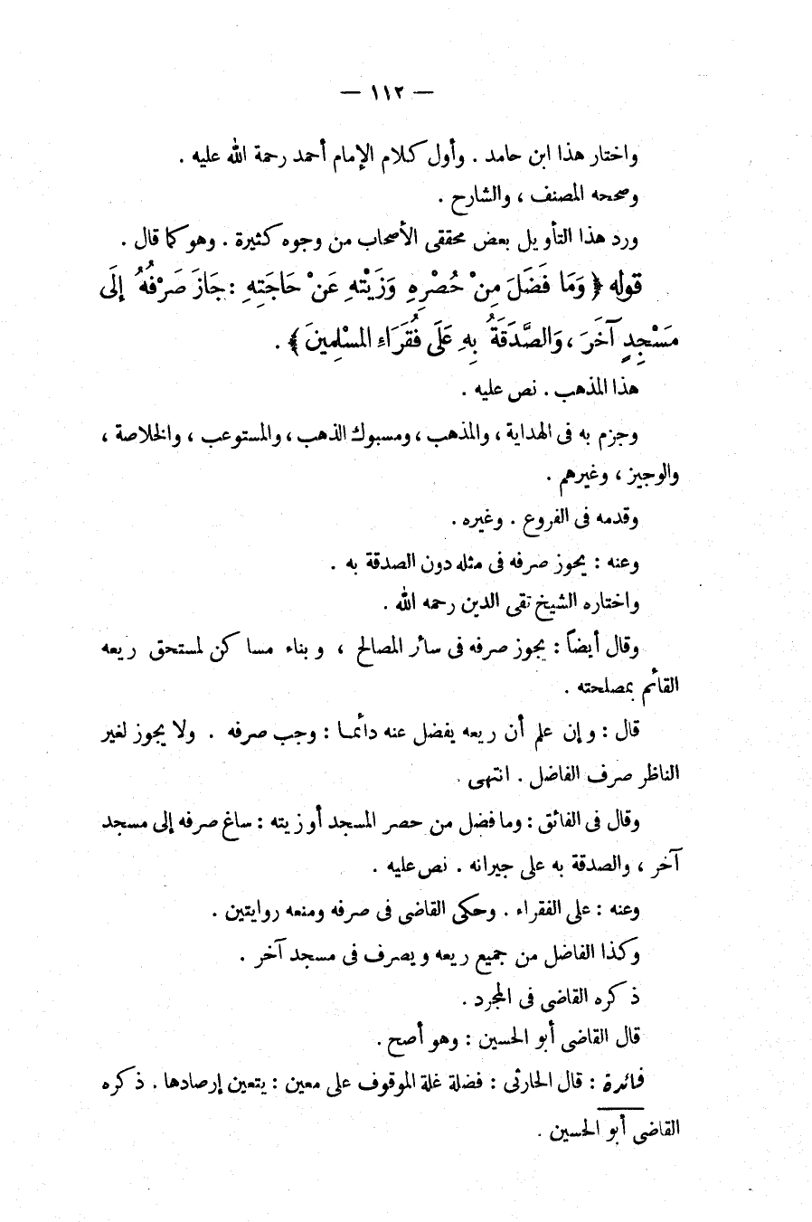 وَاخْتَارَ هَذَا ابْنُ حَامِدٍ. وَأَوَّلَ كَلَامَ الْإِمَامِ أَحْمَدَ رَحْمَةُ اللَّهِ عَلَيْهِ. وَصَحَّحَهُ الْمُصَنِّفُ، وَالشَّارِحُ. وَرَدَّ هَذَا التَّأْوِيلَ بَعْضُ مُحَقِّقِي الْأَصْحَابِ مِنْ وُجُوهٍ كَثِيرَةٍ. وَهُوَ كَمَا قَالَ. قَوْلُهُ (وَمَا فَضَلَ مِنْ حُصْرِهِ وَزَيْتِهِ عَنْ حَاجَتِهِ: جَازَ صَرْفُهُ إلَى مَسْجِدٍ آخَرَ، وَالصَّدَقَةُ بِهِ عَلَى فُقَرَاءِ الْمُسْلِمِينَ) . هَذَا الْمَذْهَبُ. نَصَّ عَلَيْهِ. وَجَزَمَ بِهِ فِي الْهِدَايَةِ، وَالْمُذْهَبِ، وَمَسْبُوكِ الذَّهَبِ، وَالْمُسْتَوْعِبِ، وَالْخُلَاصَةِ، وَالْوَجِيزِ، وَغَيْرِهِمْ. وَقَدَّمَهُ فِي الْفُرُوعِ. وَغَيْرِهِ. وَعَنْهُ: يَجُوزُ صَرْفُهُ فِي مِثْلِهِ دُونَ الصَّدَقَةِ بِهِ. وَاخْتَارَهُ الشَّيْخُ تَقِيُّ الدِّينِ - رَحِمَهُ اللَّهُ -. وَقَالَ أَيْضًا: يَجُوزُ صَرْفُهُ فِي سَائِرِ الْمَصَالِحِ، وَبِنَاءِ مَسَاكِنَ لِمُسْتَحِقِّ رِيعِهِ الْقَائِمِ بِمَصْلَحَتِهِ. قَالَ: وَإِنْ عُلِمَ أَنَّ رِيعَهُ يَفْضُلُ عَنْهُ دَائِمًا: وَجَبَ صَرْفُهُ. وَلَا يَجُوزُ لِغَيْرِ النَّاظِرِ صَرْفُ الْفَاضِلِ. انْتَهَى. وَقَالَ فِي الْفَائِقِ: وَمَا فَضَلَ مِنْ حُصُرِ الْمَسْجِدِ أَوْ زَيْتِهِ: سَاغَ صَرْفُهُ إلَى مَسْجِدٍ آخَرَ، وَالصَّدَقَةُ بِهِ عَلَى جِيرَانِهِ. نَصَّ عَلَيْهِ. وَعَنْهُ: عَلَى الْفُقَرَاءِ. وَحَكَى الْقَاضِي فِي صَرْفِهِ وَمَنْعِهِ رِوَايَتَيْنِ. وَكَذَا الْفَاضِلُ مِنْ جَمِيعِ رِيعِهِ وَيُصْرَفُ فِي مَسْجِدٍ آخَرَ. ذَكَرَهُ الْقَاضِي فِي الْمُجَرَّدِ. قَالَ الْقَاضِي أَبُو الْحُسَيْنِ: وَهُوَ أَصَحُّ.
