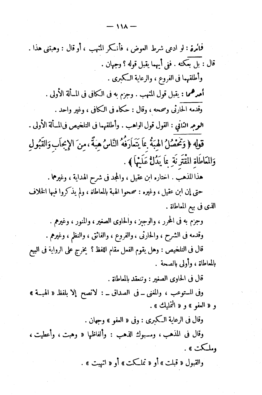 فَائِدَةٌ: لَوْ ادَّعَى شَرْطَ الْعِوَضِ، فَأَنْكَرَ الْمُتَّهَبُ، أَوْ قَالَ: وَهَبْتنِي هَذَا. قَالَ: بَلْ بِعْتُكَهُ. فَفِي أَيِّهِمَا يُقْبَلُ قَوْلُهُ؟ وَجْهَانِ. وَأَطْلَقَهُمَا فِي الْفُرُوعِ، وَالرِّعَايَةِ الْكُبْرَى.