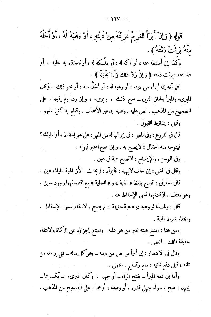 اعْلَمْ أَنَّهُ إذَا أَبْرَأَهُ مِنْ دَيْنِهِ، أَوْ وَهَبَهُ لَهُ، أَوْ أَحَلَّهُ مِنْهُ، أَوْ نَحْوَ ذَلِكَ وَكَانَ الْمُبَرِّئُ وَالْمُبَرَّأُ يَعْلَمَانِ الدَّيْنَ صَحَّ ذَلِكَ، وَبَرِئَ وَإِنْ رَدَّهُ وَلَمْ يَقْبَلْهُ. عَلَى الصَّحِيحِ مِنْ الْمَذْهَبِ. نَصَّ عَلَيْهِ. وَعَلَيْهِ جَمَاهِيرُ الْأَصْحَابِ. وَقَطَعَ بِهِ كَثِيرٌ مِنْهُمْ. وَقِيلَ: يُشْتَرَطُ الْقَبُولُ.