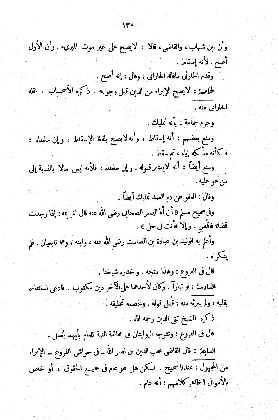 السَّابِعَةُ: قَالَ الْقَاضِي مُحِبُّ الدِّينِ بْنُ نَصْرِ اللَّهِ فِي حَوَاشِي الْفُرُوعِ الْإِبْرَاءُ مِنْ الْمَجْهُولِ: عِنْدَنَا صَحِيحٌ. لَكِنْ هَلْ هُوَ عَامٌّ فِي جَمِيعِ الْحُقُوقِ، أَوْ خَاصٌّ بِالْأَمْوَالِ؟ ظَاهِرُ كَلَامِهِمْ: أَنَّهُ عَامٌّ.