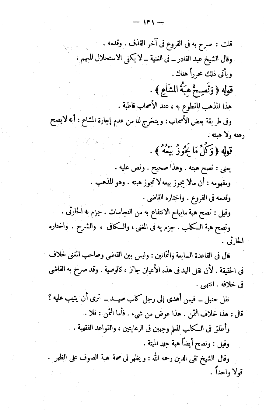 قَوْلُهُ (وَتَصِحُّ هِبَةُ الْمُشَاعِ) . هَذَا الْمَذْهَبُ الْمَقْطُوعُ بِهِ، عِنْدَ الْأَصْحَابِ قَاطِبَةً. وَفِي طَرِيقِ بَعْضِ الْأَصْحَابِ: وَيَتَخَرَّجُ لَنَا مِنْ عَدَمِ إجَارَةِ الْمُشَاعِ: أَنَّهُ لَا يَصِحُّ رَهْنُهُ وَلَا هِبَتُهُ. وَقَوْلُهُ (وَكُلُّ مَا يَجُوزُ بَيْعُهُ) . يَعْنِي: تَصِحُّ هِبَتُهُ. وَهَذَا صَحِيحٌ. وَنَصَّ عَلَيْهِ. وَمَفْهُومُهُ: أَنَّ مَا لَا يَجُوزُ بَيْعُهُ لَا تَجُوزُ هِبَتُهُ. وَهُوَ الْمَذْهَبُ. وَقَدَّمَهُ فِي الْفُرُوعِ. وَاخْتَارَهُ الْقَاضِي. وَقِيلَ: تَصِحُّ هِبَةُ مَا يُبَاحُ الِانْتِفَاعُ بِهِ مِنْ النَّجَاسَاتِ. جَزَمَ بِهِ الْحَارِثِيُّ. وَتَصِحُّ هِبَةُ الْكَلْبِ. جَزَمَ بِهِ فِي الْمُغْنِي، وَالْكَافِي، وَالشَّرْحِ. وَاخْتَارَهُ الْحَارِثِيُّ. قَالَ فِي الْقَاعِدَةِ السَّابِعَةِ وَالثَّمَانِينَ: وَلَيْسَ بَيْنَ الْقَاضِي وَصَاحِبِ الْمُغْنِي خِلَافٌ فِي الْحَقِيقَةِ. لِأَنَّ نَقْلَ الْيَدِ فِي هَذِهِ الْأَعْيَانِ جَائِزٌ، كَالْوَصِيَّةِ. وَقَدْ صَرَّحَ بِهِ الْقَاضِي فِي خِلَافِهِ. انْتَهَى. نَقَلَ حَنْبَلٌ فِيمَنْ أَهْدَى إلَى رَجُلٍ كَلْبَ صَيْدٍ تَرَى أَنْ يُثِيبَ عَلَيْهِ؟ قَالَ: هَذَا خِلَافُ الثَّمَنِ. هَذَا عِوَضٌ مِنْ شَيْءٍ. فَأَمَّا الثَّمَنُ: فَلَا. وَأَطْلَقَ فِي الْكَلْبِ الْمُعَلَّمِ وَجْهَيْنِ فِي الرِّعَايَتَيْنِ، وَالْقَوَاعِدِ الْفِقْهِيَّةِ. وَقِيلَ: وَتَصِحُّ أَيْضًا هِبَةُ جِلْدِ الْمَيْتَةِ. وَقَالَ الشَّيْخُ تَقِيُّ الدِّينِ - رَحِمَهُ اللَّهُ -: وَيَظْهَرُ لِي صِحَّةُ هِبَةِ الصُّوفِ عَلَى الظَّهْرِ قَوْلًا وَاحِدًا.