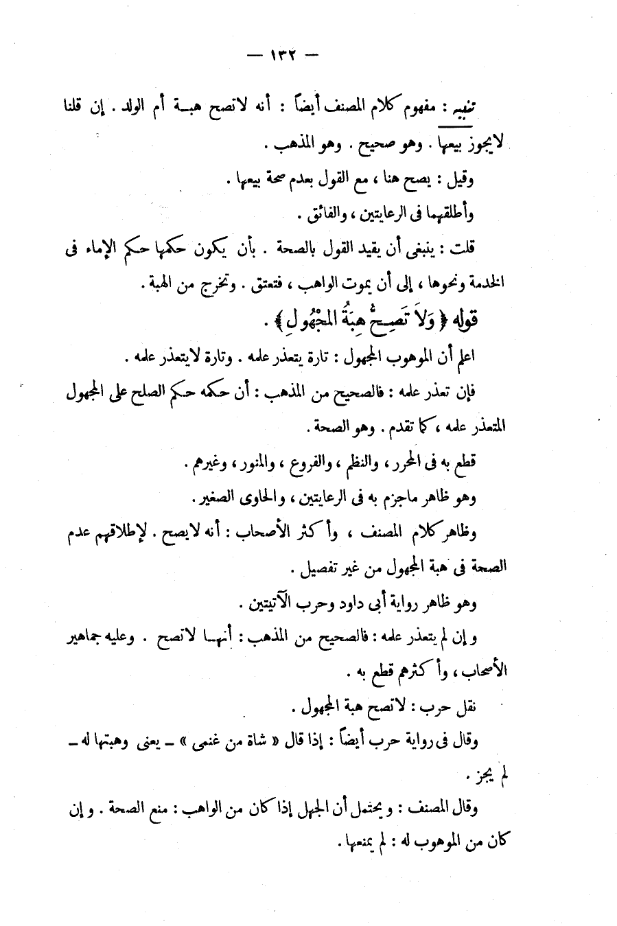 قَوْلُهُ (وَلَا تَصِحُّ هِبَةُ الْمَجْهُولِ) . اعْلَمْ أَنَّ الْمَوْهُوبَ الْمَجْهُولَ: تَارَةً يَتَعَذَّرُ عِلْمُهُ. وَتَارَةً لَا يَتَعَذَّرُ عِلْمُهُ. فَإِنْ تَعَذَّرَ عِلْمُهُ: فَالصَّحِيحُ مِنْ الْمَذْهَبِ: أَنَّ حُكْمَهُ حُكْمُ الصُّلْحِ عَلَى الْمَجْهُولِ الْمُتَعَذِّرِ عِلْمُهُ، كَمَا تَقَدَّمَ. وَهُوَ الصِّحَّةُ. قَطَعَ بِهِ فِي الْمُحَرَّرِ، وَالنَّظْمِ، وَالْفُرُوعِ، وَالْمُنَوِّرِ، وَغَيْرِهِمْ. وَهُوَ ظَاهِرُ مَا جَزَمَ بِهِ فِي الرِّعَايَتَيْنِ، وَالْحَاوِي الصَّغِيرِ. وَظَاهِرُ كَلَامِ الْمُصَنِّفِ، وَأَكْثَرِ الْأَصْحَابِ: أَنَّهُ لَا يَصِحُّ. لِإِطْلَاقِهِمْ عَدَمَ الصِّحَّةِ فِي هِبَةِ الْمَجْهُولِ مِنْ غَيْرِ تَفْصِيلٍ. وَهُوَ ظَاهِرُ رِوَايَةِ أَبِي دَاوُد وَحَرْبٍ الْآتِيَتَيْنِ. وَإِنْ لَمْ يَتَعَذَّرْ عِلْمُهُ: فَالصَّحِيحُ مِنْ الْمَذْهَبِ: أَنَّهَا لَا تَصِحُّ. وَعَلَيْهِ جَمَاهِيرُ الْأَصْحَابِ، وَأَكْثَرُهُمْ قَطَعَ بِهِ. نَقَلَ حَرْبٌ: لَا تَصِحُّ هِبَةُ الْمَجْهُولِ.