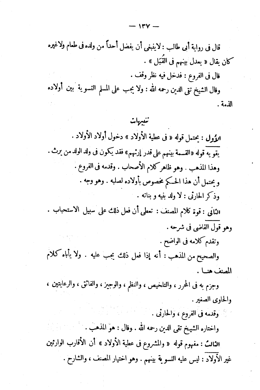 قَالَ فِي رِوَايَةِ أَبِي طَالِبٍ: لَا يَنْبَغِي أَنْ يُفَضِّلَ أَحَدًا مِنْ وَلَدِهِ فِي طَعَامٍ وَلَا غَيْرِهِ. كَأَنْ يُقَالَ " يَعْدِلُ بَيْنَهُمْ فِي الْقُبَلِ ". قَالَ فِي الْفُرُوعِ: فَدَخَلَ فِيهِ نَظَرُ وَقْفٍ. وَقَالَ الشَّيْخُ تَقِيُّ الدِّينِ - رَحِمَهُ اللَّهُ -: وَلَا يَجِبُ عَلَى الْمُسْلِمِ التَّسْوِيَةُ بَيْنَ أَوْلَادِهِ فِي الذِّمَّةِ.