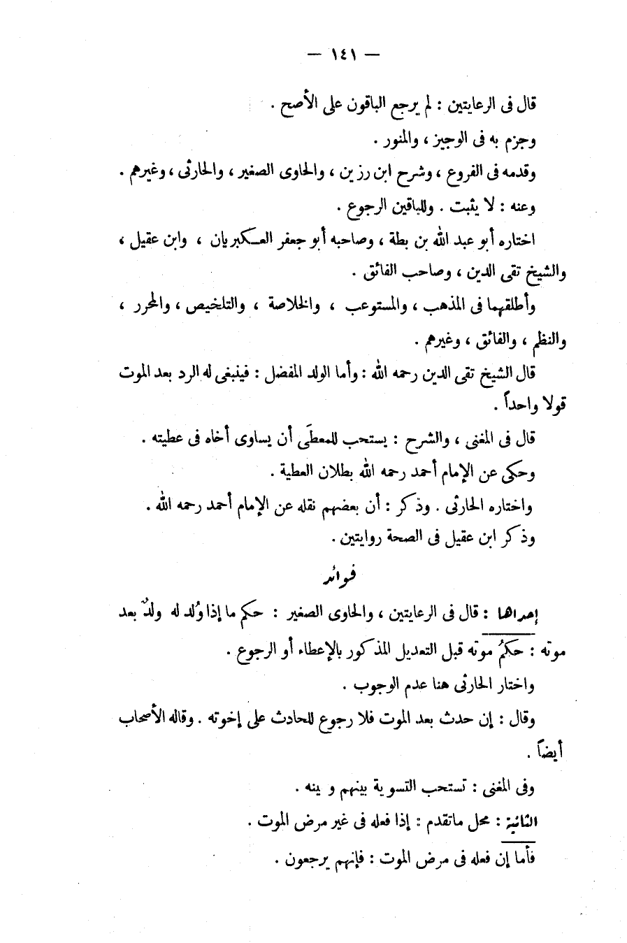 فَوَائِدُ: إحْدَاهَا: قَالَ فِي الرِّعَايَتَيْنِ، وَالْحَاوِي الصَّغِيرِ: حُكْمُ مَا إذَا وُلِدَ لَهُ وَلَدٌ بَعْدَ مَوْتِهِ: حُكْمُ مَوْتِهِ قَبْلَ التَّعْدِيلِ الْمَذْكُورِ بِالْإِعْطَاءِ أَوْ الرُّجُوعِ. وَاخْتَارَ الْحَارِثِيُّ هُنَا عَدَمَ الْوُجُوبِ. وَقَالَ: إنْ حَدَثَ بَعْدَ الْمَوْتِ فَلَا رُجُوعَ لِلْحَادِثِ عَلَى إخْوَتِهِ. وَقَالَهُ الْأَصْحَابُ أَيْضًا. وَفِي الْمُغْنِي: تُسْتَحَبُّ التَّسْوِيَةُ بَيْنَهُمْ وَبَيْنَهُ.
