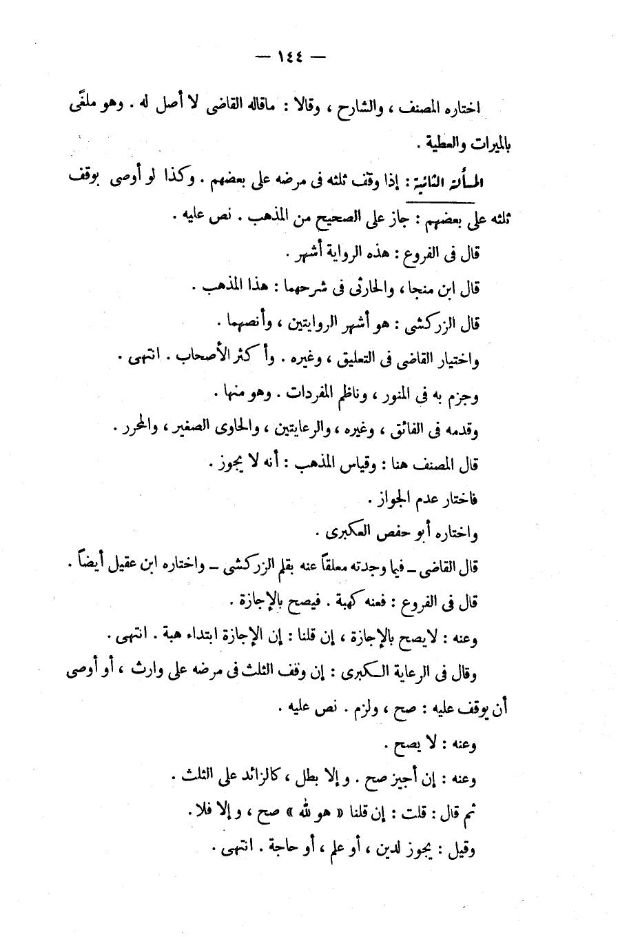 الْمَسْأَلَةُ الثَّانِيَةُ: إذَا وَقَفَ ثُلُثَهُ فِي مَرَضِهِ عَلَى بَعْضِهِمْ. وَكَذَا لَوْ أَوْصَى بِوَقْفِ ثُلُثِهِ عَلَى بَعْضِهِمْ: جَازَ عَلَى الصَّحِيحِ مِنْ الْمَذْهَبِ. نَصَّ عَلَيْهِ. قَالَ فِي الْفُرُوعِ: هَذِهِ الرِّوَايَةُ أَشْهَرُ. قَالَ ابْنُ مُنَجَّا، وَالْحَارِثِيُّ فِي شَرْحِهِمَا: هَذَا الْمَذْهَبُ. قَالَ الزَّرْكَشِيُّ: هُوَ أَشْهَرُ الرِّوَايَتَيْنِ، وَأَنَصُّهُمَا. وَاخْتِيَارُ الْقَاضِي فِي التَّعْلِيقِ، وَغَيْرِهِ. وَأَكْثَرِ الْأَصْحَابِ. انْتَهَى. وَجَزَمَ بِهِ فِي الْمُنَوِّرِ، وَنَاظِمُ الْمُفْرَدَاتِ. وَهُوَ مِنْهَا. وَقَدَّمَهُ فِي الْفَائِقِ، وَغَيْرِهِ، وَالرِّعَايَتَيْنِ، وَالْحَاوِي الصَّغِيرِ، وَالْمُحَرَّرِ. قَالَ الْمُصَنِّفُ هُنَا: وَقِيَاسُ الْمَذْهَبِ: أَنَّهُ لَا يَجُوزُ. فَاخْتَارَ عَدَمَ الْجَوَازِ. وَاخْتَارَهُ أَبُو حَفْصٍ الْعُكْبَرِيُّ