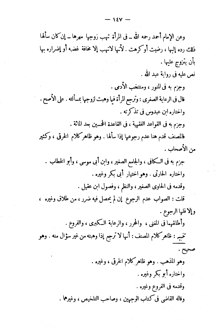 وَعَنْ الْإِمَامِ أَحْمَدَ - رَحِمَهُ اللَّهُ - فِي الْمَرْأَةِ تَهَبُ زَوْجَهَا مَهْرَهَا إنْ كَانَ سَأَلَهَا ذَلِكَ رَدَّهُ إلَيْهَا، رَضِيَتْ أَوْ كَرِهَتْ. لِأَنَّهَا لَا تَهَبُ إلَّا مَخَافَةَ غَضَبِهِ أَوْ إضْرَارِهِ بِهَا بِأَنْ يَتَزَوَّجَ عَلَيْهَا. نَصَّ عَلَيْهِ فِي رِوَايَةِ عَبْدِ اللَّهِ. وَجَزَمَ بِهِ فِي الْمُنَوِّرِ، وَمُنْتَخَبِ الْأَدَمِيِّ. قَالَ فِي الرِّعَايَةِ الصُّغْرَى: وَتَرْجِعُ الْمَرْأَةُ فِيمَا وَهَبَتْ لِزَوْجِهَا بِمَسْأَلَتِهِ. عَلَى الْأَصَحِّ. وَاخْتَارَهُ ابْنُ عَبْدُوسٍ فِي تَذْكِرَتِهِ. وَجَزَمَ بِهِ فِي الْقَوَاعِدِ الْفِقْهِيَّةِ، فِي الْقَاعِدَةِ الْخَمْسِينَ بَعْدَ الْمِائَةِ. فَالْمُصَنِّفُ قَدَّمَ هُنَا عَدَمَ رُجُوعِهَا إذَا سَأَلَهَا. وَهُوَ ظَاهِرُ كَلَامِ الْخِرَقِيِّ، وَكَثِيرٍ مِنْ الْأَصْحَابِ. جَزَمَ بِهِ فِي الْكَافِي، وَالْجَامِعِ الصَّغِيرِ، وَابْنُ أَبِي مُوسَى، وَأَبُو الْخَطَّابِ. وَاخْتَارَهُ الْحَارِثِيُّ. وَهُوَ اخْتِيَارُ أَبِي بَكْرٍ وَغَيْرِهِ. وَقَدَّمَهُ فِي الْحَاوِي الصَّغِيرِ، وَالنَّظْمِ، وَفُصُولِ ابْنِ عَقِيلٍ.