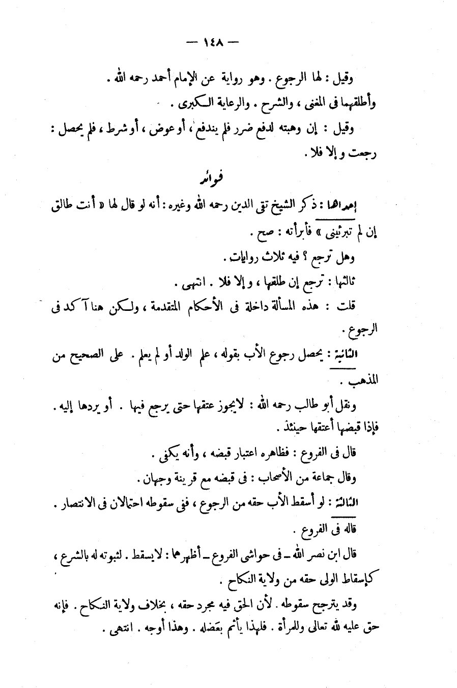 وَقِيلَ: لَهَا الرُّجُوعُ. وَهُوَ رِوَايَةٌ عَنْ الْإِمَامِ أَحْمَدَ - رَحِمَهُ اللَّهُ -. أَطْلَقَهُمَا فِي الْمُغْنِي، وَالشَّرْحِ وَالرِّعَايَةِ الْكُبْرَى. وَقِيلَ: إنْ وَهَبَتْهُ لِدَفْعِ ضَرَرٍ فَلَمْ يَنْدَفِعْ، أَوْ عِوَضٍ، أَوْ شَرْطٍ، فَلَمْ يَحْصُلْ: رَجَعَتْ وَإِلَّا فَلَا.