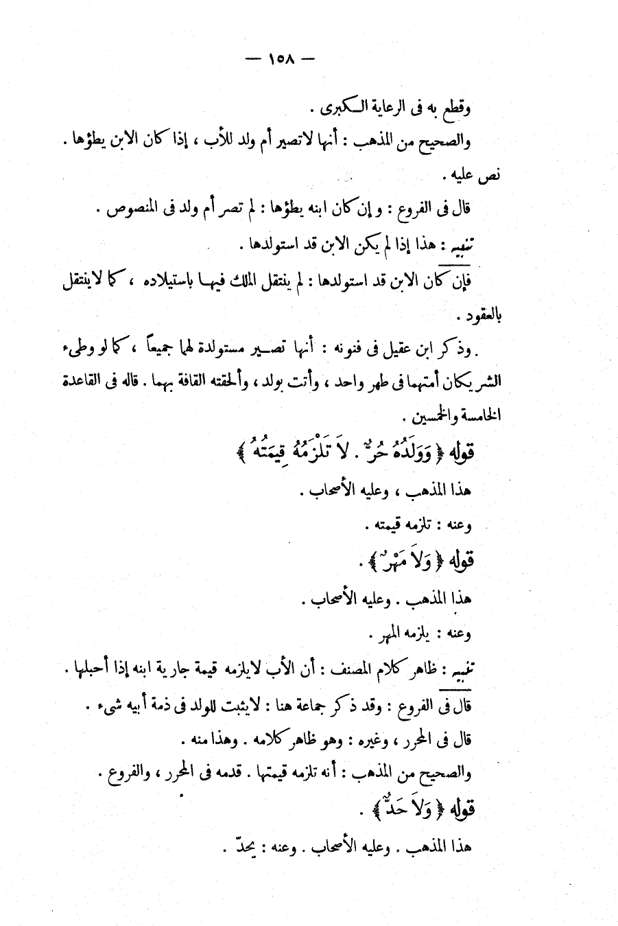 تَنْبِيهٌ: ظَاهِرُ كَلَامِ الْمُصَنِّفِ: أَنَّ الْأَبَ لَا يَلْزَمُهُ قِيمَةُ جَارِيَةِ ابْنِهِ إذَا أَحْبَلَهَا. قَالَ فِي الْفُرُوعِ: وَقَدْ ذَكَرَ جَمَاعَةٌ هُنَا: لَا يَثْبُتُ لِلْوَلَدِ فِي ذِمَّةِ أَبِيهِ شَيْءٌ. قَالَ فِي الْمُحَرَّرِ، وَغَيْرِهِ: وَهُوَ ظَاهِرُ كَلَامِهِ. وَهَذَا مِنْهُ. وَالصَّحِيحُ مِنْ الْمَذْهَبِ: أَنَّهُ تَلْزَمُهُ قِيمَتُهَا. قَدَّمَهُ فِي الْمُحَرَّرِ، وَالْفُرُوعِ. قَوْلُهُ (وَلَا حَدٌّ) . هَذَا الْمَذْهَبُ. وَعَلَيْهِ الْأَصْحَابُ. وَعَنْهُ: يُحَدُّ.