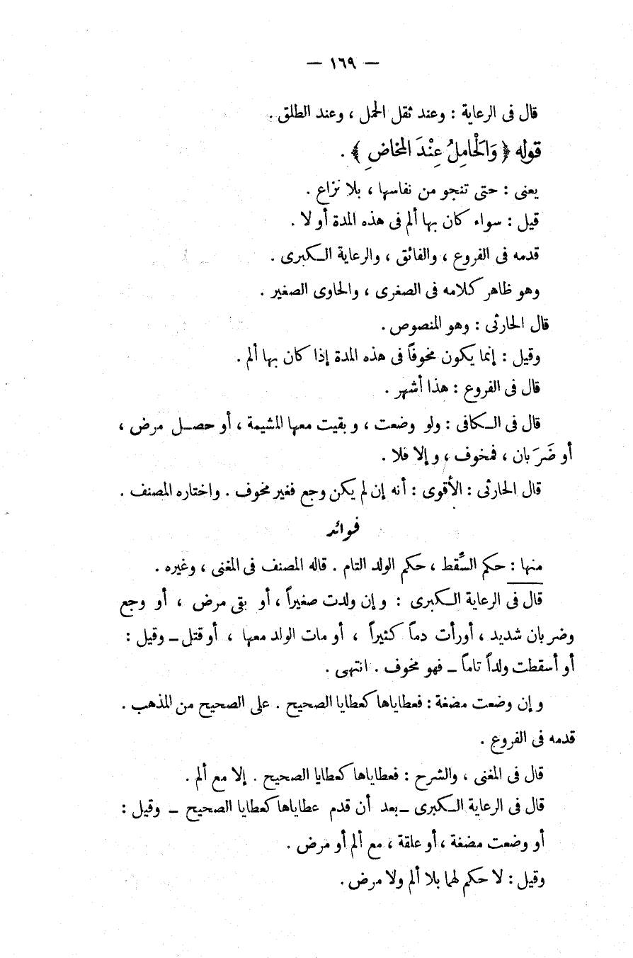 قَالَ فِي الرِّعَايَةِ: وَعِنْدَ ثِقَلِ الْحَمْلِ، وَعِنْدَ الطَّلْقِ. قَوْلُهُ (وَالْحَامِلُ عِنْدَ الْمَخَاضِ) . يَعْنِي: حَتَّى تَنْجُوَ مِنْ نِفَاسِهَا، بِلَا نِزَاعٍ. قِيلَ: سَوَاءٌ كَانَ بِهَا أَلَمٌ فِي هَذِهِ الْمُدَّةِ أَوْ لَا. قَدَّمَهُ فِي الْفُرُوعِ، وَالْفَائِقِ، وَالرِّعَايَةِ الْكُبْرَى. وَهُوَ ظَاهِرُ كَلَامِهِ فِي الصُّغْرَى، وَالْحَاوِي الصَّغِيرِ. قَالَ الْحَارِثِيُّ: وَهُوَ الْمَنْصُوصُ. وَقِيلَ: إنَّمَا يَكُونُ مَخُوفًا فِي هَذِهِ الْمُدَّةِ إذَا كَانَ بِهَا أَلَمٌ. قَالَ فِي الْفُرُوعِ: هَذَا أَشْهَرُ. قَالَ فِي الْكَافِي: وَلَوْ وَضَعَتْ، وَبَقِيَتْ مَعَهَا الْمَشِيمَةُ، أَوْ حَصَلَ مَرَضٌ، أَوْ ضَرَبَانٌ، فَمَخُوفٌ، وَإِلَّا فَلَا. قَالَ الْحَارِثِيُّ: الْأَقْوَى: أَنَّهُ إنْ لَمْ يَكُنْ وَجَعٌ فَغَيْرُ مَخُوفٍ. وَاخْتَارَهُ الْمُصَنِّفُ.