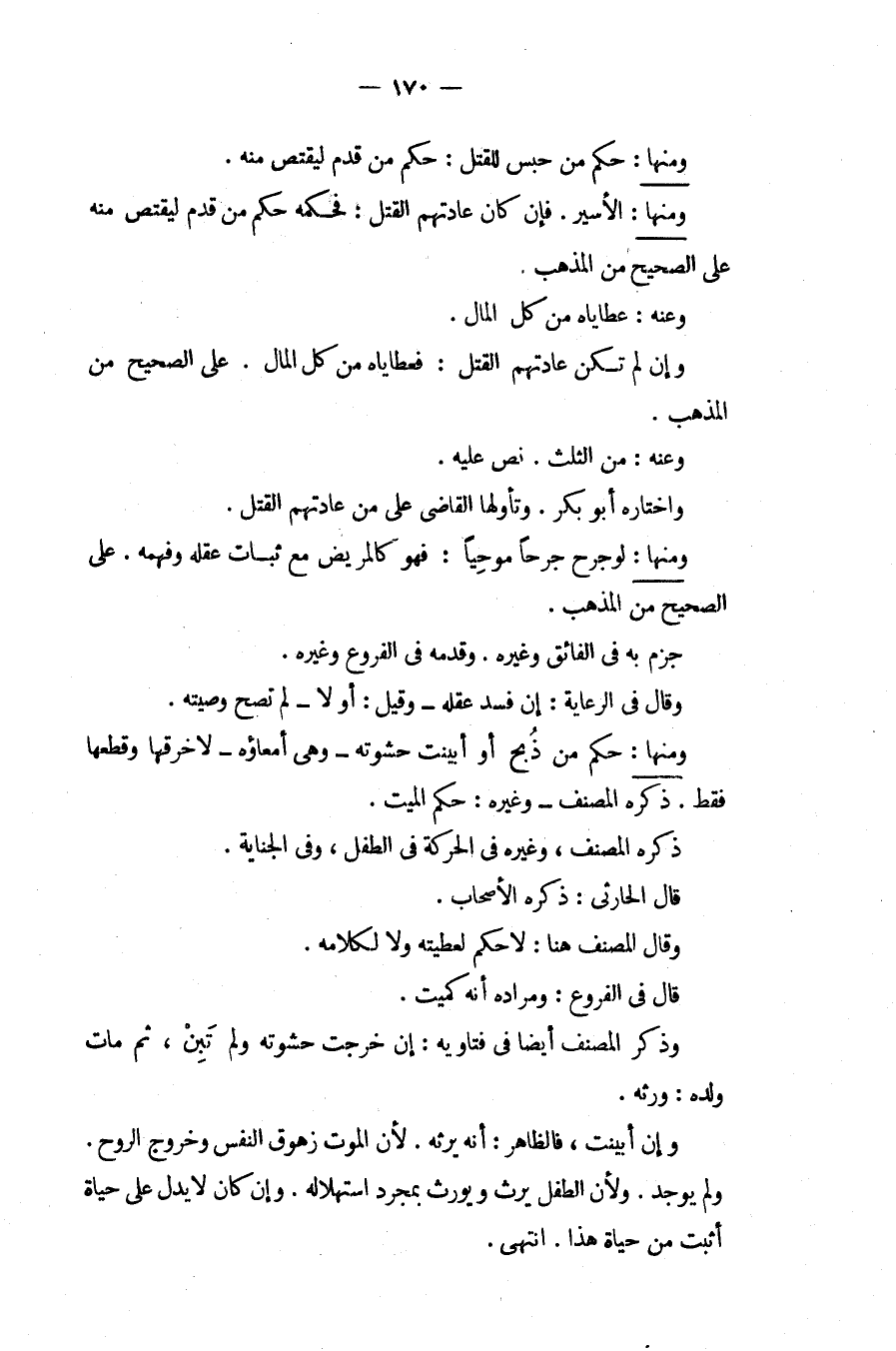 وَمِنْهَا: حُكْمُ مَنْ ذُبِحَ أَوْ أُبِينَتْ حَشْوَتُهُ وَهِيَ أَمْعَاؤُهُ لَا خَرْقُهَا وَقَطْعُهَا فَقَطْ. ذَكَرَهُ الْمُصَنِّفُ وَغَيْرُهُ: حُكْمُ الْمَيِّتِ. ذَكَرَهُ الْمُصَنِّفُ، وَغَيْرُهُ فِي الْحَرَكَةِ فِي الطِّفْلِ، وَفِي الْجِنَايَةِ. قَالَ الْحَارِثِيُّ: ذَكَرَهُ الْأَصْحَابُ. وَقَالَ الْمُصَنِّفُ هُنَا: لَا حُكْمَ لِعَطِيَّتِهِ وَلَا لِكَلَامِهِ. قَالَ فِي الْفُرُوعِ: وَمُرَادُهُ أَنَّهُ كَمَيِّتٍ. وَذَكَرَ الْمُصَنِّفُ أَيْضًا فِي فَتَاوِيهِ: إنْ خَرَجَتْ حَشْوَتُهُ وَلَمْ تُبَنْ، ثُمَّ مَاتَ وَلَدُهُ: وَرِثَهُ. وَإِنْ أُبِينَتْ، فَالظَّاهِرُ: أَنَّهُ يَرِثُهُ. لِأَنَّ الْمَوْتَ زَهُوقُ النَّفْسِ وَخُرُوجُ الرُّوحِ. وَلَمْ يُوجَدْ. وَلِأَنَّ الطِّفْلَ يَرِثُ وَيُورَثُ بِمُجَرَّدِ اسْتِهْلَالِهِ. وَإِنْ كَانَ لَا يَدُلُّ عَلَى حَيَاةٍ أَثْبَتَ مِنْ حَيَاةِ هَذَا. انْتَهَى.