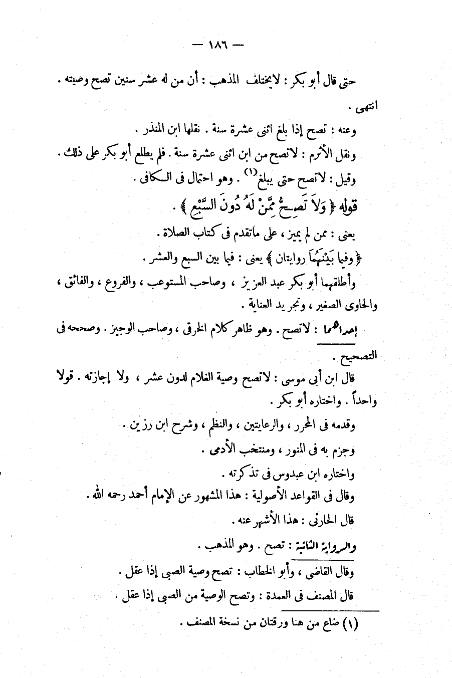 حَتَّى قَالَ أَبُو بَكْرٍ: لَا يَخْتَلِفُ الْمَذْهَبُ: أَنَّ مَنْ لَهُ عَشْرُ سِنِينَ تَصِحُّ وَصِيَّتُهُ. انْتَهَى. وَعَنْهُ: تَصِحُّ إذَا بَلَغَ اثْنَيْ عَشْرَةَ سَنَةً. نَقَلَهَا ابْنُ الْمُنْذِرِ. وَنَقَلَ الْأَثْرَمُ: لَا تَصِحُّ مِنْ ابْنِ اثْنَيْ عَشْرَةَ سَنَةً. فَلَمْ يَطَّلِعْ أَبُو بَكْرٍ عَلَى ذَلِكَ. وَقِيلَ: لَا تَصِحُّ حَتَّى يَبْلُغَ. وَهُوَ احْتِمَالٌ فِي الْكَافِي
