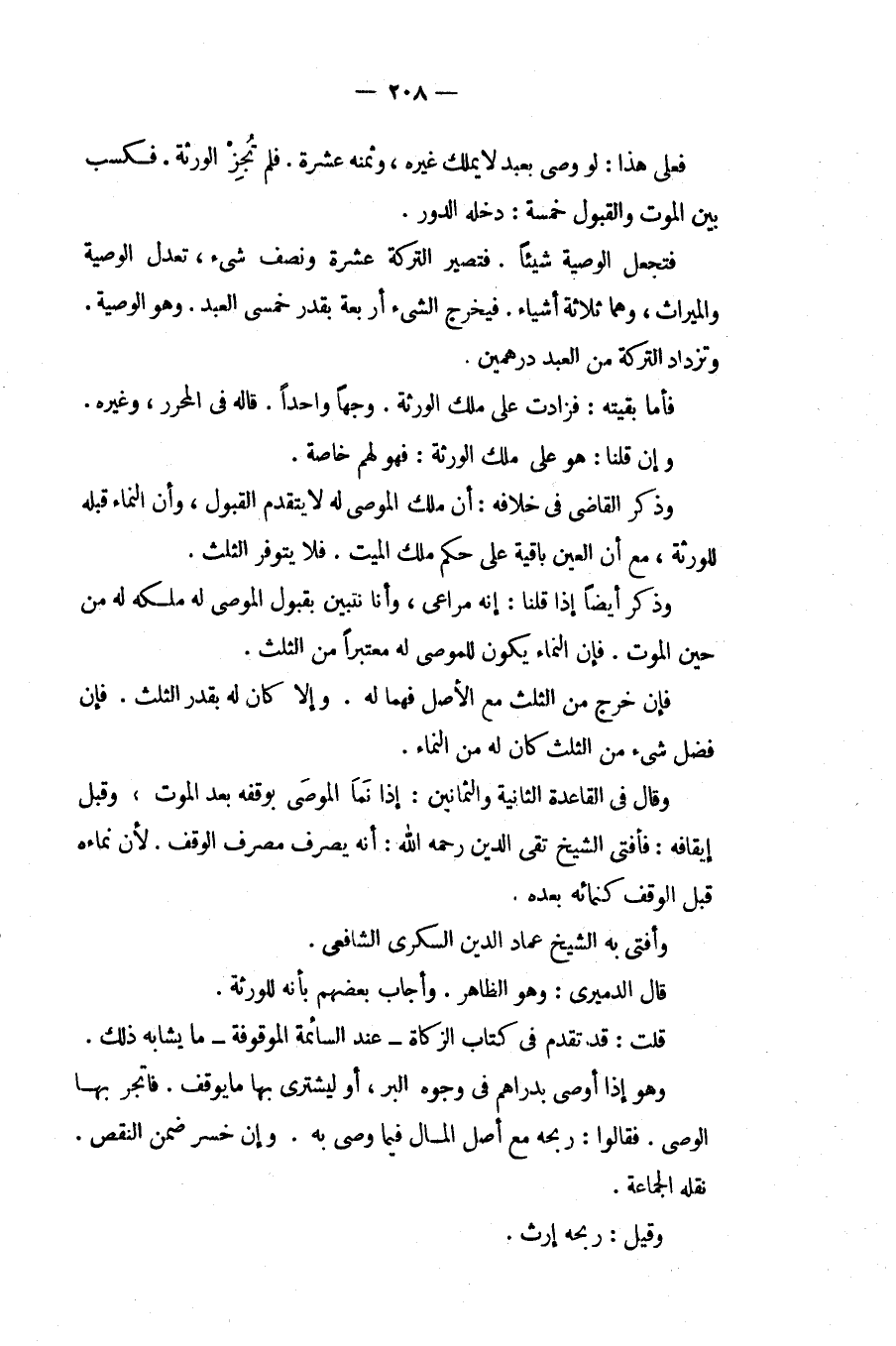 وَقَالَ فِي الْقَاعِدَةِ الثَّانِيَةِ وَالثَّمَانِينَ: إذَا نَمَا الْمُوصَى وَقْفُهُ بَعْدَ الْمَوْتِ، وَقَبْلَ إيقَافِهِ: فَأَفْتَى الشَّيْخُ تَقِيُّ الدِّينِ - رَحِمَهُ اللَّهُ -: أَنَّهُ يُصْرَفُ مَصْرِفَ الْوَقْفِ. لِأَنَّ نَمَاءَهُ قَبْلَ الْوَقْفِ كَنَمَائِهِ بَعْدَهُ. وَأَفْتَى بِهِ الشَّيْخُ عِمَادُ الدِّينِ السُّكَّرِيُّ الشَّافِعِيُّ. قَالَ الدَّمِيرِيُّ: وَهُوَ الظَّاهِرُ. وَأَجَابَ بَعْضُهُمْ بِأَنَّهُ لِلْوَرَثَةِ. قُلْت: قَدْ تَقَدَّمَ فِي كِتَابِ الزَّكَاةِ عِنْدَ السَّائِمَةِ الْمَوْقُوفَةِ مَا يُشَابِهُ ذَلِكَ. وَهُوَ إذَا أَوْصَى بِدَرَاهِمَ فِي وُجُوهِ الْبِرِّ، أَوْ لِيَشْتَرِيَ بِهَا مَا يُوقَفُ. فَاتَّجَرَ بِهَا الْوَصِيُّ. فَقَالُوا: رِبْحُهُ مَعَ أَصْلِ الْمَالِ فِيمَا وَصَّى بِهِ. وَإِنْ خَسِرَ ضَمِنَ النَّقْصَ. نَقَلَهُ الْجَمَاعَةُ. وَقِيلَ: رِبْحُهُ إرْثٌ.