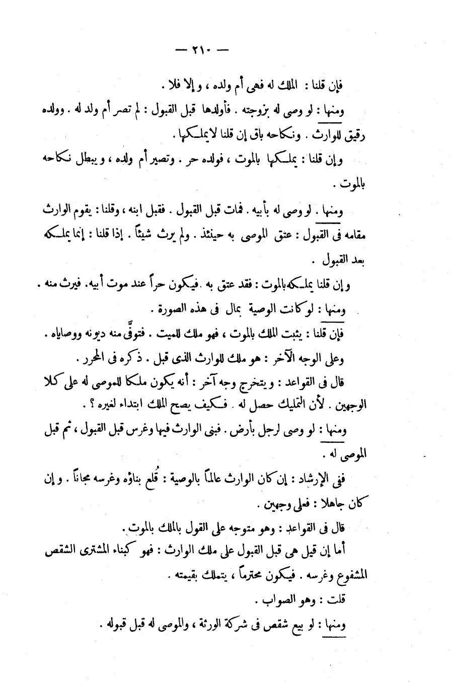 وَمِنْهَا: لَوْ وَصَّى لِرَجُلٍ بِأَرْضٍ. فَبَنَى الْوَارِثُ فِيهَا وَغَرَسَ قَبْلَ الْقَبُولِ، ثُمَّ قَبِلَ الْمُوصَى لَهُ. فَفِي الْإِرْشَادِ: إنْ كَانَ الْوَارِثُ عَالِمًا بِالْوَصِيَّةِ: قُلِعَ بِنَاؤُهُ وَغَرْسُهُ مَجَّانًا. وَإِنْ كَانَ جَاهِلًا: فَعَلَى وَجْهَيْنِ. قَالَ فِي الْقَوَاعِدِ: وَهُوَ مُتَوَجِّهٌ عَلَى الْقَوْلِ بِالْمِلْكِ بِالْمَوْتِ. أَمَّا إنْ قِيلَ هِيَ قَبْلَ الْقَبُولِ عَلَى مِلْكِ الْوَارِثِ: فَهُوَ كَبِنَاءِ الْمُشْتَرِي الشِّقْصَ الْمَشْفُوعَ وَغَرْسِهِ. فَيَكُونُ مُحْتَرَمًا، يُتَمَلَّكُ بِقِيمَتِهِ. قُلْت: وَهُوَ الصَّوَابُ.