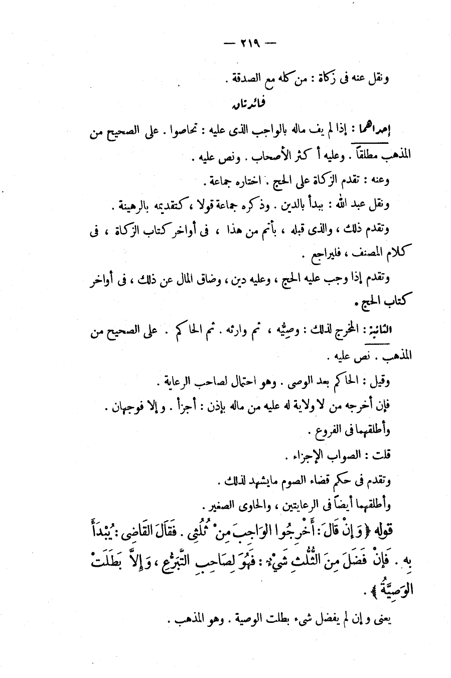 إحْدَاهُمَا: إذَا لَمْ يَفِ مَالُهُ بِالْوَاجِبِ الَّذِي عَلَيْهِ: تَحَاصُّوا. عَلَى الصَّحِيحِ مِنْ الْمَذْهَبِ مُطْلَقًا. وَعَلَيْهِ أَكْثَرُ الْأَصْحَابِ. وَنَصَّ عَلَيْهِ. وَعَنْهُ تُقَدَّمُ الزَّكَاةُ عَلَى الْحَجِّ. اخْتَارَهُ جَمَاعَةٌ. وَنَقَلَ عَبْدُ اللَّهِ: يَبْدَأُ بِالدَّيْنِ. وَذَكَرَهُ جَمَاعَةٌ قَوْلًا كَتَقْدِيمِهِ بِالرَّهِينَةِ. وَتَقَدَّمَ ذَلِكَ، وَاَلَّذِي قَبْلَهُ، بِأَتَمَّ مِنْ هَذَا، فِي أَوَاخِرِ كِتَابِ الزَّكَاةِ، فِي كَلَامِ الْمُصَنِّفِ، فَلْيُرَاجَعْ. وَتَقَدَّمَ إذَا وَجَبَ عَلَيْهِ الْحَجُّ، وَعَلَيْهِ دَيْنٌ، وَضَاقَ الْمَالُ عَنْ ذَلِكَ، فِي أَوَاخِرِ كِتَابِ الْحَجِّ.