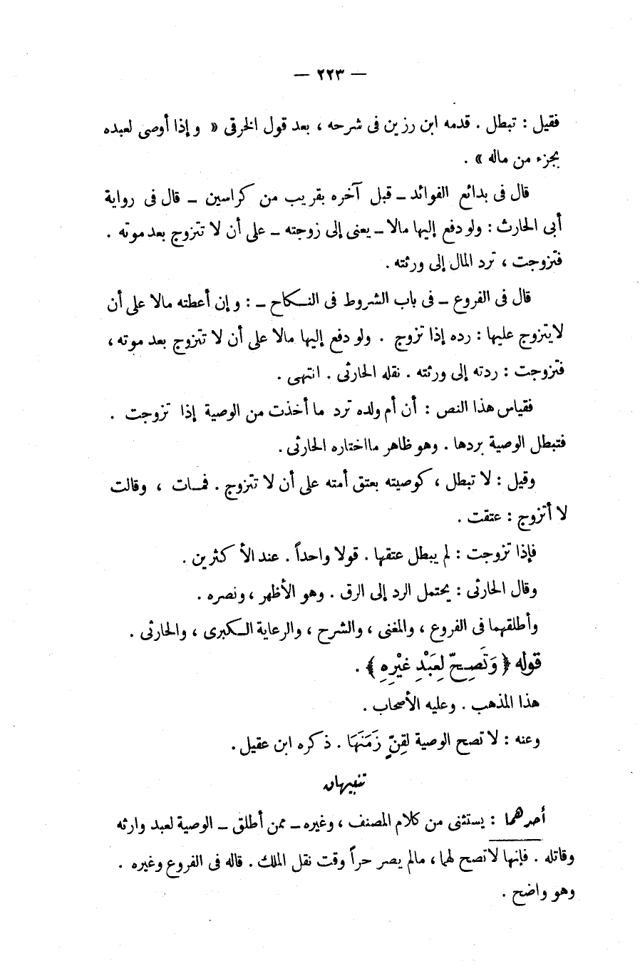 قَالَ فِي بَدَائِعِ الْفَوَائِدِ قَبْلَ آخِرِهِ بِقَرِيبٍ مِنْ كَرَاسِينَ قَالَ فِي رِوَايَةِ أَبِي الْحَارِثِ: وَلَوْ دَفَعَ إلَيْهَا مَالًا يَعْنِي إلَى زَوْجَتِهِ عَلَى أَنْ لَا تَتَزَوَّجَ بَعْدَ مَوْتِهِ. فَتَزَوَّجَتْ، تَرُدُّ الْمَالَ إلَى وَرَثَتِهِ. قَالَ فِي الْفُرُوعِ فِي بَابِ الشُّرُوطِ فِي النِّكَاحِ: وَإِنْ أَعْطَتْهُ مَالًا عَلَى أَنْ لَا يَتَزَوَّجَ عَلَيْهَا: رَدَّهُ إذَا تَزَوَّجَ. وَلَوْ دَفَعَ إلَيْهَا مَالًا عَلَى أَنْ لَا تَتَزَوَّجَ بَعْدَ مَوْتِهِ، فَتَزَوَّجَتْ: رَدَّتْهُ إلَى وَرَثَتِهِ. نَقَلَهُ الْحَارِثِيُّ. انْتَهَى. فَقِيَاسُ هَذَا النَّصِّ: أَنَّ أُمَّ وَلَدِهِ تَرُدُّ مَا أَخَذَتْ مِنْ الْوَصِيَّةِ إذَا تَزَوَّجَتْ. فَتَبْطُلُ الْوَصِيَّةُ بِرَدِّهَا. وَهُوَ ظَاهِرُ مَا اخْتَارَهُ الْحَارِثِيُّ. وَقِيلَ: لَا تَبْطُلُ كَوَصِيَّتِهِ بِعِتْقِ أَمَتِهِ عَلَى أَنْ لَا تَتَزَوَّجَ. فَمَاتَ، وَقَالَتْ لَا أَتَزَوَّجُ: عَتَقَتْ. فَإِذَا تَزَوَّجَتْ: لَمْ يَبْطُلْ عِتْقُهَا. قَوْلًا وَاحِدًا. عِنْدَ الْأَكْثَرِينَ. وَقَالَ الْحَارِثِيُّ: يُحْتَمَلُ الرَّدُّ إلَى الرِّقِّ. وَهُوَ الْأَظْهَرُ، وَنَصَرَهُ. وَأَطْلَقَهُمَا فِي الْفُرُوعِ، وَالْمُغْنِي، وَالشَّرْحِ، وَالرِّعَايَةِ الْكُبْرَى، وَالْحَارِثِيِّ