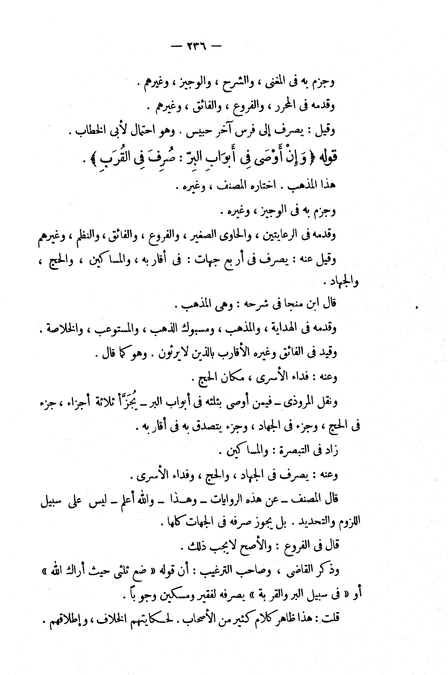 قَوْلُهُ (وَإِنْ أَوْصَى فِي أَبْوَابِ الْبِرِّ: صُرِفَ فِي الْقُرَبِ) . هَذَا الْمَذْهَبُ. اخْتَارَهُ الْمُصَنِّفُ وَغَيْرُهُ. وَجَزَمَ بِهِ فِي الْوَجِيزِ، وَغَيْرِهِ. وَقَدَّمَهُ فِي الرِّعَايَتَيْنِ، وَالْحَاوِي الصَّغِيرِ، وَالْفُرُوعِ، وَالْفَائِقِ، وَالنَّظْمِ، وَغَيْرِهِمْ وَقِيلَ عَنْهُ: يُصْرَفُ فِي أَرْبَعِ جِهَاتٍ: فِي أَقَارِبِهِ، وَالْمَسَاكِينِ، وَالْحَجِّ، وَالْجِهَادِ. قَالَ ابْنُ مُنَجَّا فِي شَرْحِهِ: وَهِيَ الْمَذْهَبُ. وَقَدَّمَهُ فِي الْهِدَايَةِ وَالْمُذْهَبِ، وَمَسْبُوكِ الذَّهَبِ، وَالْمُسْتَوْعِبِ، وَالْخُلَاصَةِ. وَقُيِّدَ فِي الْفَائِقِ وَغَيْرُهُ الْأَقَارِبُ بِاَلَّذِينَ لَا يَرِثُونَ. وَهُوَ كَمَا قَالَ. وَعَنْهُ: فِدَاءُ الْأَسْرَى، مَكَانَ الْحَجِّ. وَنَقَلَ الْمَرُّوذِيُّ فِيمَنْ أَوْصَى بِثُلُثِهِ فِي أَبْوَابِ الْبِرِّ يُجَزَّأُ ثَلَاثَةَ أَجْزَاءٍ، جُزْءٌ فِي الْحَجِّ، وَجُزْءٌ فِي الْجِهَادِ، وَجُزْءٌ يُتَصَدَّقُ بِهِ فِي أَقَارِبِهِ. زَادَ فِي التَّبْصِرَةِ: وَالْمَسَاكِينِ. وَعَنْهُ: يُصْرَفُ فِي الْجِهَادِ، وَالْحَجِّ، وَفِدَاءِ الْأَسْرَى. قَالَ الْمُصَنِّفُ عَنْ هَذِهِ الرِّوَايَاتِ وَهَذَا وَاَللَّهُ أَعْلَمُ لَيْسَ عَلَى سَبِيلِ اللُّزُومِ وَالتَّحْدِيدِ. بَلْ يَجُوزُ صَرْفُهُ فِي الْجِهَاتِ كُلِّهَا. قَالَ فِي الْفُرُوعِ: وَالْأَصَحُّ لَا يَجِبُ ذَلِكَ.
