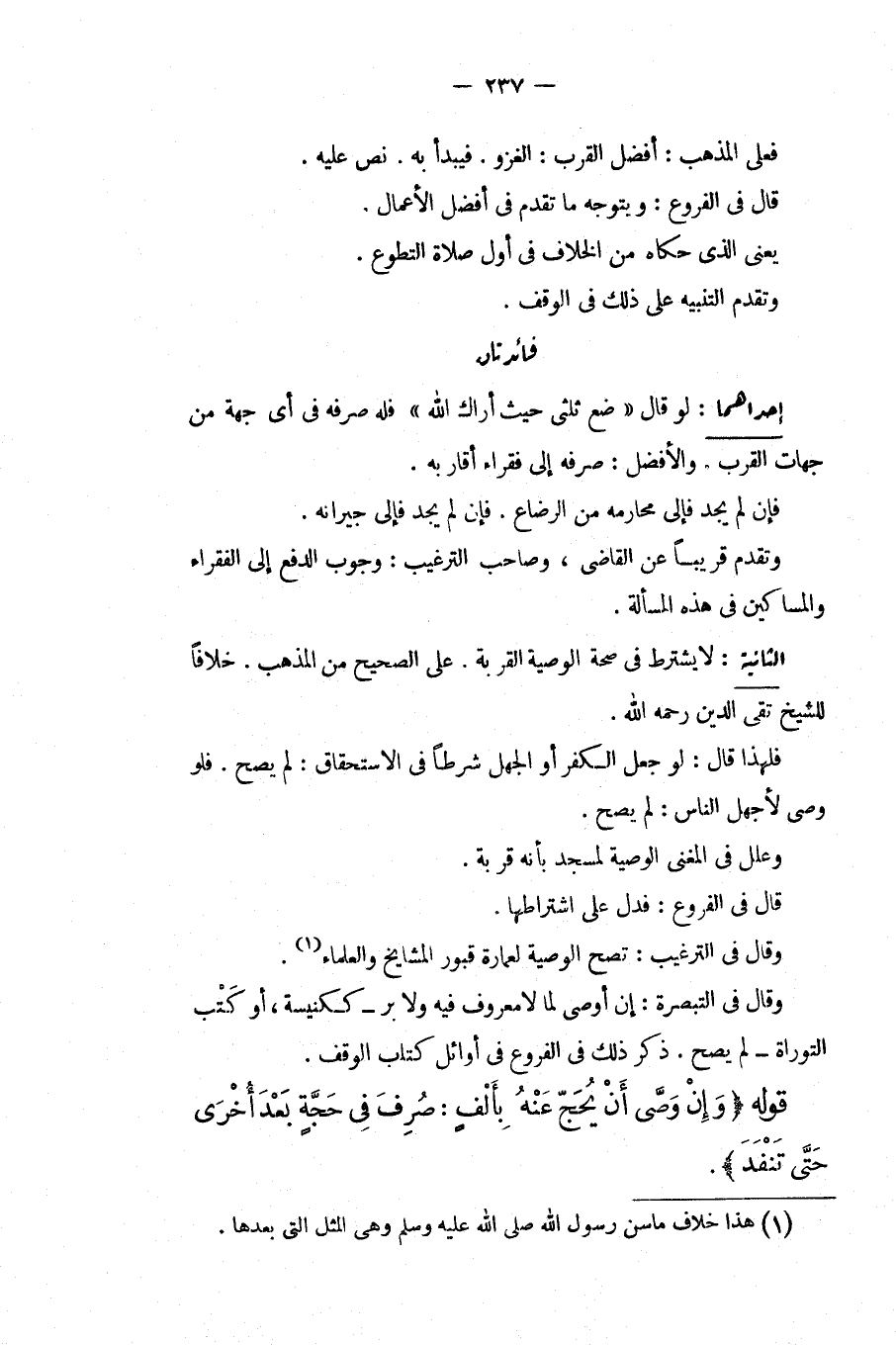 إحْدَاهُمَا: لَوْ قَالَ " ضَعْ ثُلُثِي حَيْثُ أَرَاك اللَّهُ " فَلَهُ صَرْفُهُ فِي أَيِّ جِهَةٍ مِنْ جِهَاتِ الْقُرَبِ وَالْأَفْضَلُ: صَرْفُهُ إلَى فُقَرَاءِ أَقَارِبِهِ. فَإِنْ لَمْ يَجِدْ فَإِلَى مَحَارِمِهِ مِنْ الرَّضَاعِ. فَإِنْ لَمْ يَجِدْ فَإِلَى جِيرَانِهِ. وَتَقَدَّمَ قَرِيبًا عَنْ الْقَاضِي، وَصَاحِبِ التَّرْغِيبِ: وُجُوبُ الدَّفْعِ إلَى الْفُقَرَاءِ وَالْمَسَاكِينِ فِي هَذِهِ الْمَسْأَلَةِ. الثَّانِيَةُ: لَا يُشْتَرَطُ فِي صِحَّةِ الْوَصِيَّةِ الْقُرْبَةُ. عَلَى الصَّحِيحِ مِنْ الْمَذْهَبِ. خِلَافًا لِلشَّيْخِ تَقِيِّ الدِّينِ - رَحِمَهُ اللَّهُ - فَلِهَذَا قَالَ لَوْ جَعَلَ الْكُفْرَ أَوْ الْجَهْلَ شَرْطًا فِي الِاسْتِحْقَاقِ: لَمْ يَصِحَّ. فَلَوْ وَصَّى لِأَجْهَلْ النَّاسِ: لَمْ يَصِحَّ. وَعَلَّلَ فِي الْمُغْنِي الْوَصِيَّةَ لِمَسْجِدٍ بِأَنَّهُ قُرْبَةٌ. قَالَ فِي الْفُرُوعِ: فَدَلَّ عَلَى اشْتِرَاطِهَا. وَقَالَ فِي التَّرْغِيبِ: تَصِحُّ الْوَصِيَّةُ لِعِمَارَةِ قُبُورِ الْمَشَايِخِ وَالْعُلَمَاءِ. وَقَالَ فِي التَّبْصِرَةِ: إنْ أَوْصَى لِمَا لَا مَعْرُوفَ فِيهِ وَلَا بِرَّ كَكَنِيسَةٍ، أَوْ كَتْبِ التَّوْرَاةِ لَمْ يَصِحَّ. ذُكِرَ ذَلِكَ فِي الْفُرُوعِ فِي أَوَائِلِ كِتَابِ الْوَقْفِ.