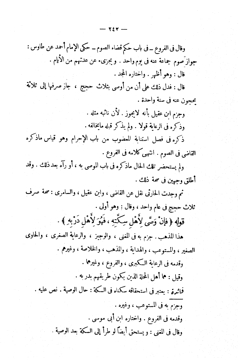 وَقَالَ فِي الْفُرُوعِ فِي بَابِ حُكْمِ قَضَاءِ الصَّوْمِ حَكَى الْإِمَامُ أَحْمَدُ عَنْ طَاوُسٍ: جَوَازَ صَوْمِ جَمَاعَةٍ عَنْهُ فِي يَوْمٍ وَاحِدٍ. وَيُجْزِئُ عَنْ عُدَّتِهِمْ مِنْ الْأَيَّامِ. قَالَ: وَهُوَ أَظْهَرُ. وَاخْتَارَهُ الْمَجْدُ. قَالَ: فَدَلَّ ذَلِكَ عَلَى أَنَّ مَنْ أَوْصَى بِثَلَاثِ حِجَجٍ، جَازَ صَرْفُهَا إلَى ثَلَاثَةٍ يَحُجُّونَ عَنْهُ فِي سَنَةٍ وَاحِدَةٍ. وَجَزَمَ ابْنُ عَقِيلٍ بِأَنَّهُ لَا يَجُوزُ. لِأَنَّ نَائِبَهُ مِثْلُهُ. وَذَكَرَهُ فِي الرِّعَايَةِ قَوْلًا. وَلَمْ يَذْكُرْ قَبْلَهُ مَا يُخَالِفُهُ. ذَكَرَهُ فِي فَصْلِ اسْتِنَابَةِ الْمَعْضُوبِ مِنْ بَابِ الْإِحْرَامِ وَهُوَ قِيَاسُ مَا ذَكَرَهُ الْقَاضِي فِي الصَّوْمِ. انْتَهَى كَلَامُهُ فِي الْفُرُوعِ. وَلَمْ يَسْتَحْضِرْ تِلْكَ الْحَالَ مَا ذَكَرَهُ فِي بَابِ الْمُوصَى بِهِ، أَوْ رَآهُ بَعْدَ ذَلِكَ. وَقَدْ أَطْلَقَ وَجْهَيْنِ فِي صِحَّةِ ذَلِكَ. ثُمَّ وَجَدْت الْحَارِثِيَّ نَقَلَ عَنْ الْقَاضِي، وَابْنِ عَقِيلٍ، وَالسَّامِرِيِّ: صِحَّةَ صَرْفِ ثَلَاثِ حِجَجٍ فِي عَامٍ وَاحِدٍ، وَقَالَ: وَهُوَ أَوْلَى.