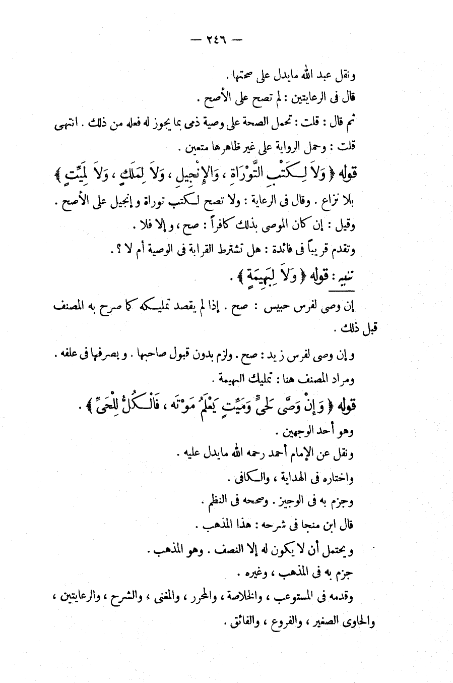 وَنَقَلَ عَبْدُ اللَّهِ مَا يَدُلُّ عَلَى صِحَّتِهَا. قَالَ فِي الرِّعَايَتَيْنِ: لَمْ تَصِحَّ عَلَى الْأَصَحِّ ثُمَّ قَالَ: قُلْت: تُحْمَلُ الصِّحَّةُ عَلَى وَصِيَّةِ ذِمِّيٍّ بِمَا يَجُوزُ لَهُ فِعْلُهُ مِنْ ذَلِكَ. انْتَهَى قُلْت: وَحَمْلُ الرِّوَايَةِ عَلَى غَيْرِ ظَاهِرِهَا مُتَعَيَّنٌ. قَوْلُهُ (وَلَا لِكَتْبِ التَّوْرَاةِ، وَالْإِنْجِيلِ، وَلَا لِمَلَكٍ، وَلَا لِمَيِّتٍ) بِلَا نِزَاعٍ. وَقَالَ فِي الرِّعَايَةِ: وَلَا تَصِحُّ لِكَتْبِ تَوْرَاةٍ وَإِنْجِيلٍ عَلَى الْأَصَحِّ. وَقِيلَ: إنْ كَانَ الْمُوصِي بِذَلِكَ كَافِرًا: صَحَّ، وَإِلَّا فَلَا. وَتَقَدَّمَ قَرِيبًا فِي فَائِدَةٍ: هَلْ تُشْتَرَطُ الْقَرَابَةُ فِي الْوَصِيَّةِ أَمْ لَا؟ .
