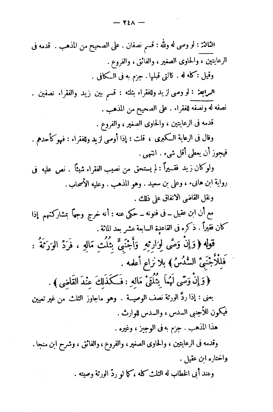 الرَّابِعَةُ: لَوْ وَصَّى لِزَيْدٍ وَلِلْفُقَرَاءِ بِثُلُثِهِ قُسِمَ بَيْنَ زَيْدٍ وَالْفُقَرَاءِ نِصْفَيْنِ. نِصْفُهُ لَهُ وَنِصْفُهُ لِلْفُقَرَاءِ. عَلَى الصَّحِيحِ مِنْ الْمَذْهَبِ. قَدَّمَهُ فِي الرِّعَايَتَيْنِ، وَالْحَاوِي الصَّغِيرِ، وَالْفُرُوعِ. وَقَالَ فِي الرِّعَايَةِ الْكُبْرَى، قُلْت: إذَا أَوْصَى لِزَيْدٍ وَلِلْفُقَرَاءِ: فَهُوَ كَأَحَدِهِمْ. فَيَجُوزُ أَنْ يُعْطَى أَقَلَّ شَيْءٍ. انْتَهَى.