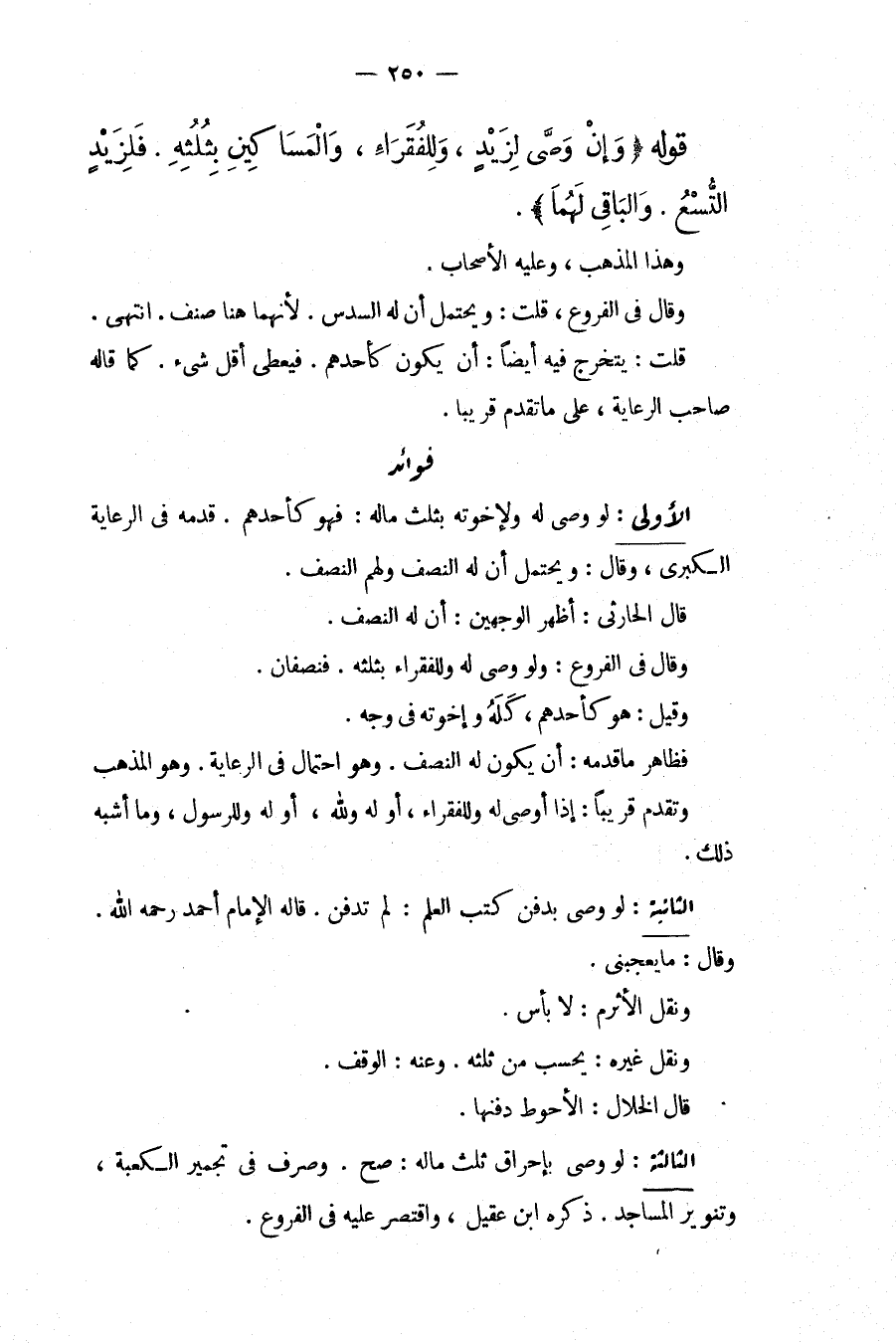 الْأُولَى: لَوْ وَصَّى لَهُ وَلِإِخْوَتِهِ بِثُلُثِ مَالِهِ: فَهُوَ كَأَحَدِهِمْ. قَدَّمَهُ فِي الرِّعَايَةِ الْكُبْرَى، وَقَالَ: وَيُحْتَمَلُ أَنَّ لَهُ النِّصْفَ وَلَهُمْ النِّصْفَ. قَالَ الْحَارِثِيُّ: أَظْهَرُ الْوَجْهَيْنِ: أَنَّ لَهُ النِّصْفَ. وَقَالَ فِي الْفُرُوعِ: وَلَوْ وَصَّى لَهُ وَلِلْفُقَرَاءِ بِثُلُثِهِ. فَنِصْفَانِ. وَقِيلَ: هُوَ كَأَحَدِهِمْ، كُلُّهُ وَإِخْوَتُهُ فِي وَجْهٍ. فَظَاهِرُ مَا قَدَّمَهُ: أَنْ يَكُونَ لَهُ النِّصْفُ. وَهُوَ احْتِمَالٌ فِي الرِّعَايَةِ. وَهُوَ الْمَذْهَبُ وَتَقَدَّمَ قَرِيبًا: إذَا أَوْصَى لَهُ وَلِلْفُقَرَاءِ، أَوْ لَهُ وَلِلَّهِ، أَوْ لَهُ وَلِلرَّسُولِ، وَمَا أَشْبَهَ ذَلِكَ. الثَّانِيَةُ: لَوْ وَصَّى بِدَفْنِ كُتُبِ الْعِلْمِ: لَمْ تُدْفَنْ. قَالَهُ الْإِمَامُ أَحْمَدُ - رَحِمَهُ اللَّهُ - وَقَالَ: مَا يُعْجِبُنِي. وَنَقَلَ الْأَثْرَمُ: لَا بَأْسَ. وَنَقَلَ غَيْرُهُ: يُحْسَبُ مِنْ ثُلُثِهِ. وَعَنْهُ: الْوَقْفُ. قَالَ الْخَلَّالُ: الْأَحْوَطُ دَفْنُهَا.