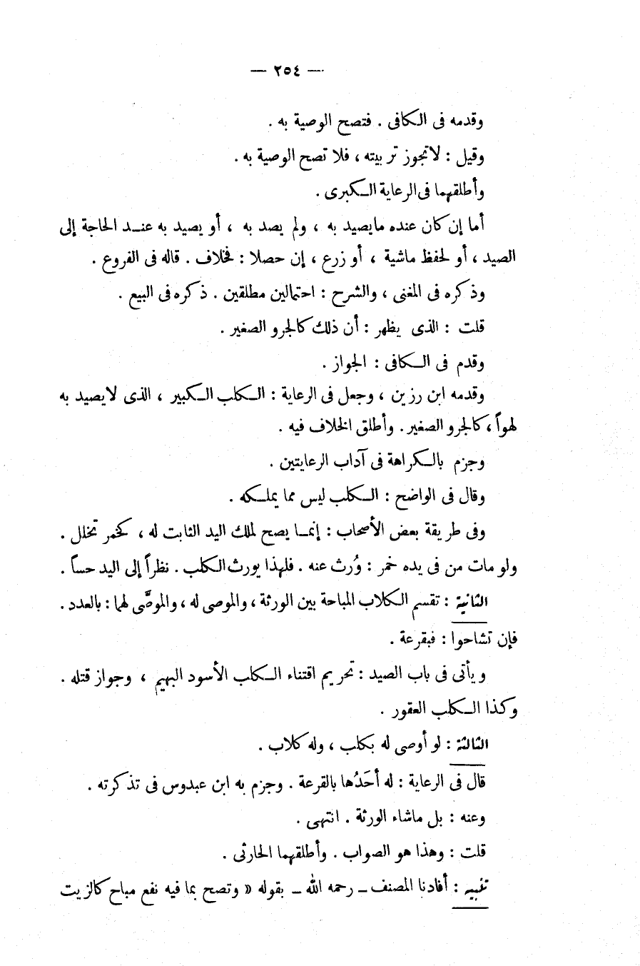 وَقَدَّمَهُ فِي الْكَافِي. فَتَصِحُّ الْوَصِيَّةُ بِهِ. وَقِيلَ. لَا تَجُوزُ تَرْبِيَتُهُ، فَلَا تَصِحُّ الْوَصِيَّةُ بِهِ. وَأَطْلَقَهُمَا فِي الرِّعَايَةِ الْكُبْرَى. أَمَّا إنْ كَانَ عِنْدَهُ مَا يَصِيدُ بِهِ، وَلَمْ يَصِدْ بِهِ، أَوْ يَصِيدُ بِهِ عِنْدَ الْحَاجَةِ إلَى الصَّيْدِ، أَوْ لِحِفْظِ مَاشِيَةٍ، أَوْ زَرْعٍ، إنْ حَصَلَا: فَخِلَافٌ. قَالَهُ فِي الْفُرُوعِ. وَذَكَرَهُ فِي الْمُغْنِي، وَالشَّرْحِ: احْتِمَالَيْنِ مُطْلَقَيْنِ. ذَكَرَهُ فِي الْبَيْعِ. قُلْت: الَّذِي يَظْهَرُ: أَنَّ ذَلِكَ كَالْجَرْوِ الصَّغِيرِ. وَقَدَّمَ فِي الْكَافِي: الْجَوَازَ. وَقَدَّمَهُ ابْنُ رَزِينٍ، وَجَعَلَ فِي الرِّعَايَةِ: الْكَلْبَ الْكَبِيرَ، الَّذِي لَا يَصِيدُ بِهِ لَهْوًا كَالْجَرْوِ الصَّغِيرِ. وَأَطْلَقَ الْخِلَافَ فِيهِ. وَجَزَمَ بِالْكَرَاهَةِ فِي آدَابِ الرِّعَايَتَيْنِ. وَقَالَ فِي الْوَاضِحِ: الْكَلْبُ لَيْسَ مِمَّا يَمْلِكُهُ. وَفِي طَرِيقَةِ بَعْضِ الْأَصْحَابِ: إنَّمَا يَصِحُّ لِمِلْكِ الْيَدِ الثَّابِتِ لَهُ كَخَمْرٍ تَخَلَّلَ. وَلَوْ مَاتَ مَنْ فِي يَدِهِ خَمْرٌ: وُرِثَ عَنْهُ. فَلِهَذَا يُورَثُ الْكَلْبُ. نَظَرًا إلَى الْيَدِ حِسًّا.