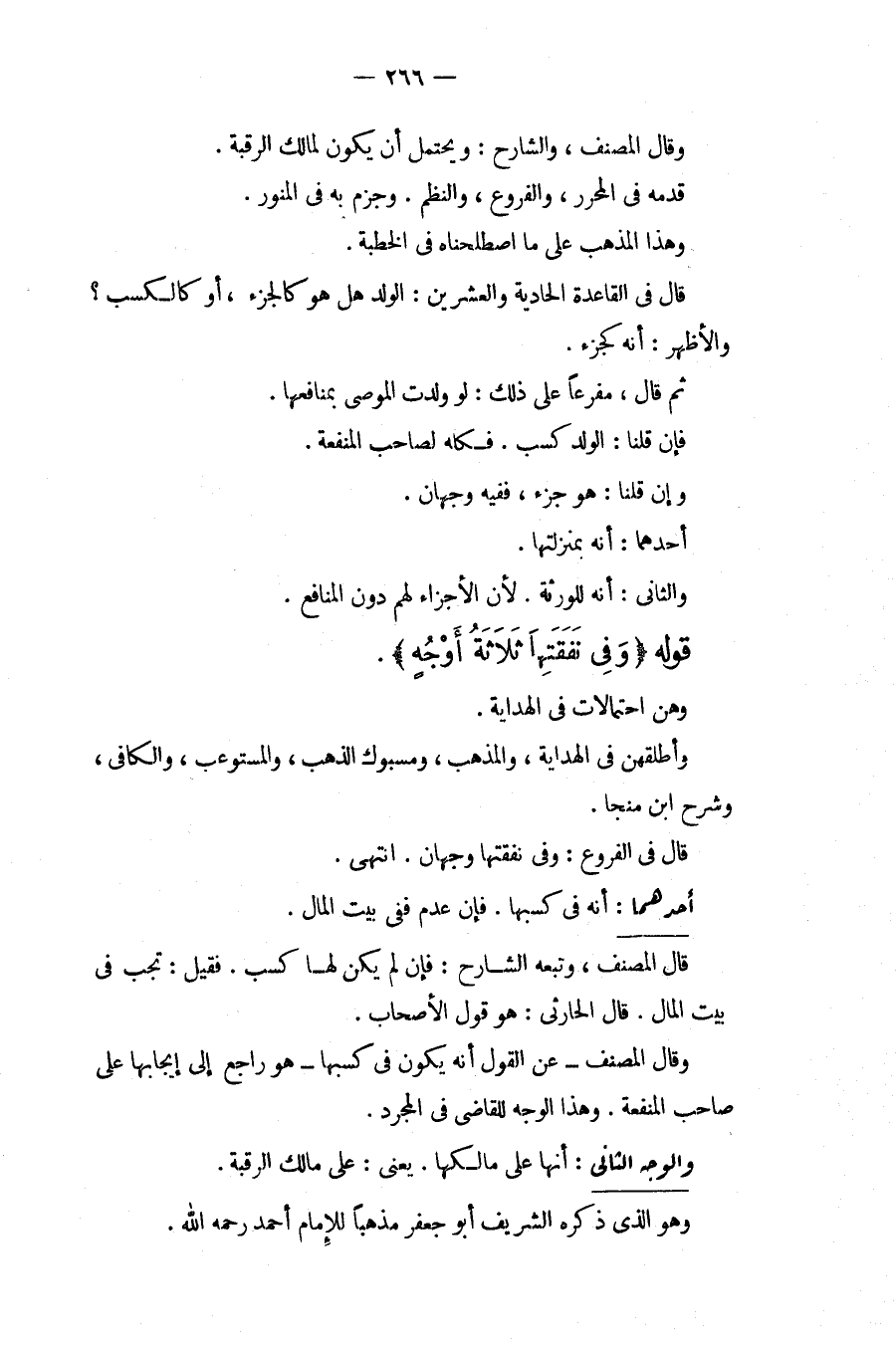 وَقَالَ الْمُصَنِّفُ، وَالشَّارِحُ: وَيُحْتَمَلُ أَنْ يَكُونَ لِمَالِكِ الرَّقَبَةِ. قَدَّمَهُ فِي الْمُحَرَّرِ، وَالْفُرُوعِ، وَالنَّظْمِ. وَجَزَمَ بِهِ فِي الْمُنَوِّرِ. وَهَذَا الْمَذْهَبُ عَلَى مَا اصْطَلَحْنَاهُ فِي الْخُطْبَةِ. قَالَ فِي الْقَاعِدَةِ الْحَادِيَةِ وَالْعِشْرِينَ: الْوَلَدُ هَلْ هُوَ كَالْجُزْءِ، أَوْ كَالْكَسْبِ؟ وَالْأَظْهَرُ: أَنَّهُ كَجُزْءٍ. ثُمَّ قَالَ، مُفَرِّعًا عَلَى ذَلِكَ: لَوْ وَلَدَتْ الْمُوصَى، بِمَنَافِعِهَا. فَإِنْ قُلْنَا: الْوَلَدُ كَسْبٌ. فَكُلُّهُ لِصَاحِبِ الْمَنْفَعَةِ. وَإِنْ قُلْنَا: هُوَ جُزْءٌ، فَفِيهِ وَجْهَانِ.