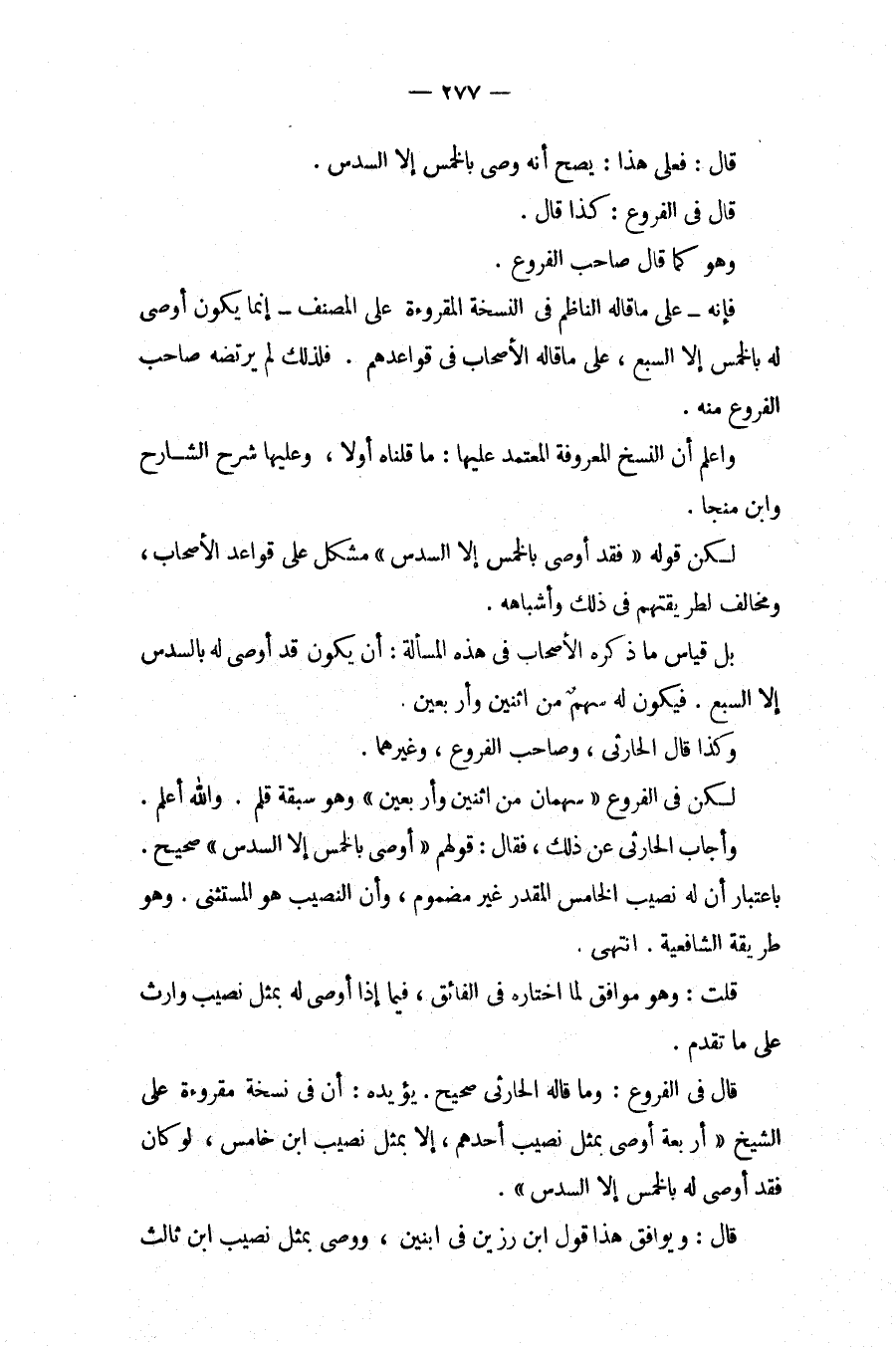 لَكِنْ فِي الْفُرُوعِ " سَهْمَانِ مِنْ اثْنَيْنِ وَأَرْبَعِينَ " وَهُوَ سِبْقَةُ قَلَمٍ. وَاَللَّهُ أَعْلَمُ. وَأَجَابَ الْحَارِثِيُّ عَنْ ذَلِكَ، فَقَالَ: قَوْلُهُمْ " أَوْصَى بِالْخُمُسِ إلَّا السُّدُسَ " صَحِيحٌ. بِاعْتِبَارِ أَنَّ لَهُ نَصِيبَ الْخَامِسِ الْمُقَدَّرِ غَيْرُ مَضْمُومٍ، وَأَنَّ النَّصِيبَ هُوَ الْمُسْتَثْنَى. وَهُوَ طَرِيقَةُ الشَّافِعِيَّةِ. انْتَهَى. قُلْت: وَهُوَ مُوَافِقٌ لِمَا اخْتَارَهُ فِي الْفَائِقِ، فِيمَا إذَا أَوْصَى لَهُ بِمِثْلِ نَصِيبِ وَارِثٍ. عَلَى مَا تَقَدَّمَ. قَالَ فِي الْفُرُوعِ: وَمَا قَالَهُ الْحَارِثِيُّ صَحِيحٌ. يُؤَيِّدُهُ: أَنَّ فِي نُسْخَةٍ مَقْرُوءَةٍ عَلَى الشَّيْخِ " أَرْبَعَةٌ أَوْصَى بِمِثْلِ نَصِيبِ أَحَدِهِمْ، إلَّا بِمِثْلِ نَصِيبِ ابْنٍ خَامِسٍ، لَوْ كَانَ فَقَدْ أَوْصَى لَهُ بِالْخُمُسِ إلَّا السُّدُسَ ". قَالَ: وَيُوَافِقُ هَذَا قَوْلَ ابْنِ رَزِينٍ فِي ابْنَيْنِ، وَوَصَّى بِمِثْلِ نَصِيبِ ابْنٍ ثَالِثٍ