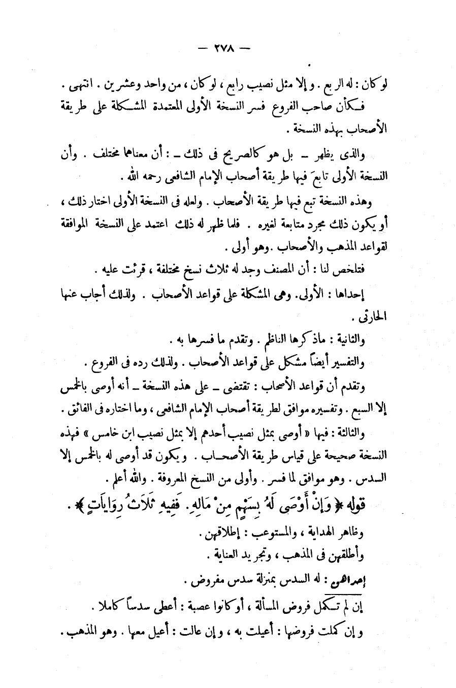 لَوْ كَانَ: لَهُ الرُّبُعُ. وَإِلَّا مِثْلَ نَصِيبِ رَابِعٍ، لَوْ كَانَ، مِنْ وَاحِدٍ وَعِشْرِينَ. انْتَهَى. فَكَأَنَّ صَاحِبَ الْفُرُوعِ فَسَّرَ النُّسْخَةَ الْأُولَى الْمُعْتَمَدَةَ الْمُشْكِلَةَ عَلَى طَرِيقَةِ الْأَصْحَابِ بِهَذِهِ النُّسْخَةِ.