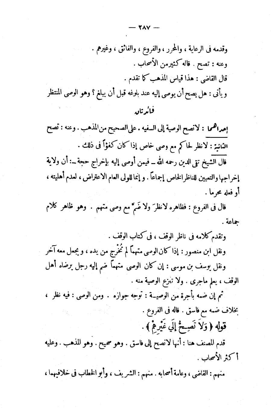 وَنَقَلَ ابْنُ مَنْصُورٍ: إذَا كَانَ الْوَصِيُّ مُتَّهَمًا لَمْ تَخْرُجْ مِنْ يَدِهِ، وَيُجْعَلُ مَعَهُ آخَرُ وَنَقَلَ يُوسُفُ بْنُ مُوسَى: إنْ كَانَ الْوَصِيُّ مُتَّهَمًا ضُمَّ إلَيْهِ رَجُلٌ يَرْضَاهُ أَهْلُ الْوَقْفِ، يَعْلَمُ مَا جَرَى. وَلَا تُنْزَعُ الْوَصِيَّةُ مِنْهُ. ثُمَّ إنْ ضَمَّهُ بِأُجْرَةٍ مِنْ الْوَصِيَّةِ: تَوَجَّهَ جَوَازُهُ. وَمِنْ الْوَصِيِّ: فِيهِ نَظَرٌ، بِخِلَافِ ضَمِّهِ مَعَ فَاسِقٍ. قَالَهُ فِي الْفُرُوعِ. قَوْلُهُ (وَلَا تَصِحُّ إلَى غَيْرِهِمْ) قَدَّمَ الْمُصَنِّفُ هُنَا أَنَّهَا لَا تَصِحُّ إلَى فَاسِقٍ وَهُوَ صَحِيحٌ وَهُوَ الْمَذْهَبُ وَعَلَيْهِ أَكْثَرُ الْأَصْحَابِ. مِنْهُمْ: الْقَاضِي، وَعَامَّةُ أَصْحَابِهِ. مِنْهُمْ: الشَّرِيفُ، وَأَبُو الْخَطَّابِ فِي خِلَافَيْهِمَا