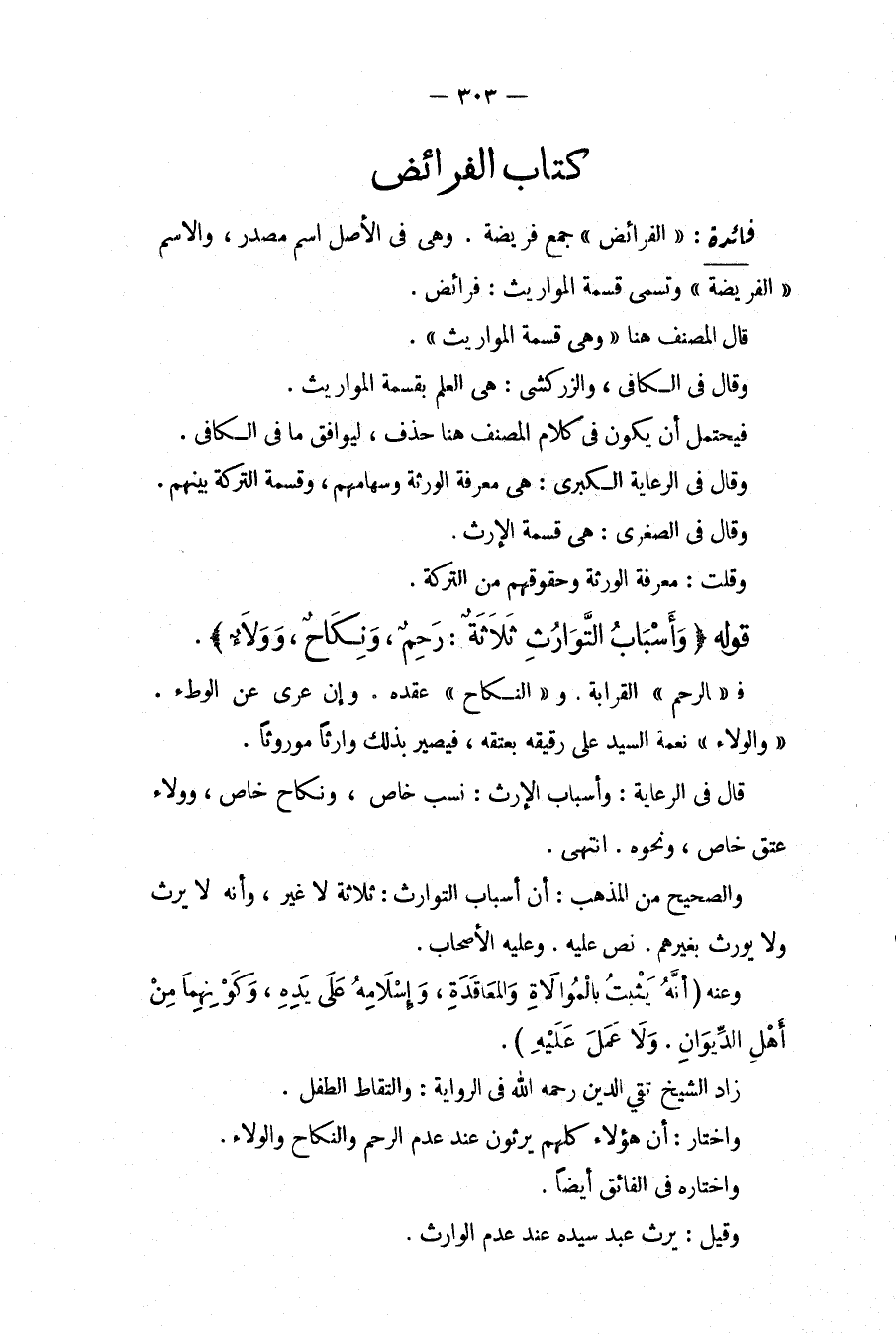 ِ فَائِدَةٌ: " الْفَرَائِضُ " جَمْعُ فَرِيضَةٍ. وَهِيَ فِي الْأَصْلِ اسْمُ مَصْدَرٍ، وَالِاسْمُ " الْفَرِيضَةُ " وَتُسَمَّى قِسْمَةُ الْمَوَارِيثِ فَرَائِضَ. قَالَ الْمُصَنِّفُ هُنَا " وَهِيَ قِسْمَةُ الْمَوَارِيثِ ". وَقَالَ فِي الْكَافِي، وَالزَّرْكَشِيِّ: هِيَ الْعِلْمُ بِقِسْمَةِ الْمَوَارِيثِ. فَيُحْتَمَلُ أَنْ يَكُونَ فِي كَلَامِ الْمُصَنِّفِ هُنَا حَذْفٌ، لِيُوَافِقَ مَا فِي الْكَافِي. وَقَالَ فِي الرِّعَايَةِ الْكُبْرَى: هِيَ مَعْرِفَةُ الْوَرَثَةِ وَسِهَامِهِمْ، وَقِسْمَةُ التَّرِكَةِ بَيْنَهُمْ. وَقَالَ فِي الصُّغْرَى: هِيَ قِسْمَةُ الْإِرْثِ. وَقُلْت: مَعْرِفَةُ الْوَرَثَةِ وَحُقُوقِهِمْ مِنْ التَّرِكَةِ. قَوْلُهُ (وَأَسْبَابُ التَّوَارُثِ ثَلَاثَةٌ: رَحِمٌ، وَنِكَاحٌ، وَوَلَاءٌ) فَ " الرَّحِمُ " الْقَرَابَةُ وَ " النِّكَاحُ " عَقْدُهُ. وَإِنْ عَرِيَ عَنْ الْوَطْءِ " وَالْوَلَاءُ " نِعْمَةُ السَّيِّدِ عَلَى رَقِيقِهِ بِعِتْقِهِ، فَيَصِيرُ بِذَلِكَ وَارِثًا مَوْرُوثًا. قَالَ فِي الرِّعَايَةِ: وَأَسْبَابُ الْإِرْثِ: نَسَبٌ خَاصٌّ، وَنِكَاحٌ خَاصٌّ، وَوَلَاءُ عِتْقٍ خَاصٌّ، وَنَحْوُهُ. انْتَهَى. وَالصَّحِيحُ مِنْ الْمَذْهَبِ: أَنَّ أَسْبَابَ التَّوَارُثِ: ثَلَاثَةٌ لَا غَيْرُ، وَأَنَّهُ لَا يَرِثُ وَلَا يُورَثُ بِغَيْرِهِمْ. نَصَّ عَلَيْهِ. وَعَلَيْهِ الْأَصْحَابُ.