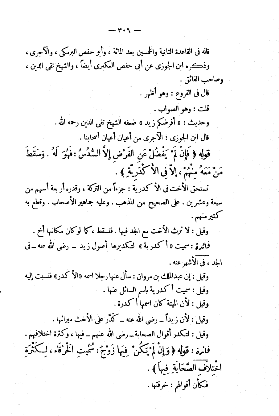 قَالَهُ فِي الْقَاعِدَةِ الثَّانِيَةِ وَالْخَمْسِينَ بَعْدَ الْمِائَةِ وَأَبُو حَفْصٍ الْبَرْمَكِيُّ وَالْآجُرِّيُّ، وَذَكَرَهُ ابْنُ الْجَوْزِيِّ عَنْ أَبِي حَفْصٍ الْعُكْبَرِيِّ أَيْضًا، وَالشَّيْخُ تَقِيُّ الدِّينِ، وَصَاحِبُ الْفَائِقِ. قَالَ فِي الْفُرُوعِ: وَهُوَ أَظْهَرُ. قُلْت: وَهُوَ الصَّوَابُ. وَحَدِيثُ: «أَفْرَضُكُمْ زَيْدٌ» ضَعَّفَهُ الشَّيْخُ تَقِيُّ الدِّينِ - رَحِمَهُ اللَّهُ - قَالَ ابْنُ الْجَوْزِيِّ: الْآجُرِّيُّ مِنْ أَعْيَانِ أَعْيَانِ أَصْحَابِنَا قَوْلُهُ (فَإِنْ لَمْ يَفْضُلْ عَنْ الْفَرْضِ إلَّا السُّدُسُ: فَهُوَ لَهُ. وَسَقَطَ مَنْ مَعَهُ مِنْهُمْ، إلَّا فِي الْأَكْدَرِيَّةِ) . تَسْتَحِقُّ الْأُخْتُ فِي الْأَكْدَرِيَّةِ جُزْءًا مِنْ التَّرِكَةِ، وَقَدْرُهُ أَرْبَعَةُ أَسْهُمٍ مِنْ سَبْعَةٍ وَعِشْرِينَ. عَلَى الصَّحِيحِ مِنْ الْمَذْهَبِ وَعَلَيْهِ جَمَاهِيرُ الْأَصْحَابِ وَقَطَعَ بِهِ كَثِيرٌ مِنْهُمْ. وَقِيلَ: لَا تَرِثُ الْأُخْتُ مَعَ الْجَدِّ فِيهَا. فَتَسْقُطُ، كَمَا لَوْ كَانَ مَكَانَهَا.
