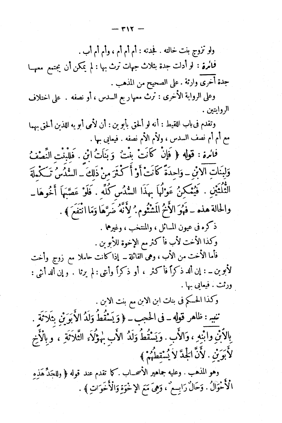 فَائِدَةٌ: قَوْلُهُ (فَإِنْ كَانَتْ بِنْتٌ وَبَنَاتُ ابْنٍ. فَلِلْبِنْتِ النِّصْفُ وَلِبَنَاتِ الِابْنِ وَاحِدَةً كَانَتْ أَوْ أَكْثَرَ مِنْ ذَلِكَ السُّدُسِ تَكْمِلَةَ الثُّلُثَيْنِ. فَيُمْكِنُ عَوْلُهَا بِهَذَا السُّدُسِ كُلِّهِ. فَلَوْ عَصَّبَهَا أَخُوهَا وَالْحَالَةُ هَذِهِ فَهُوَ الْأَخُ الْمَشْئُومُ. لِأَنَّهُ ضَرَّهَا وَمَا انْتَفَعَ) ذَكَرَهُ فِي عُيُونِ الْمَسَائِلِ، وَالْمُنْتَخَبِ، وَغَيْرِهِمَا. وَكَذَا الْأُخْتُ لِأَبٍ فَأَكْثَرَ مَعَ الْإِخْوَةِ لِلْأَبَوَيْنِ. فَأَمَّا الْأُخْتُ مِنْ الْأَبِ، وَهِيَ الْقَائِلَةُ إذَا كَانَتْ حَامِلًا مَعَ زَوْجٍ وَأُخْتٍ لِأَبَوَيْنِ: إنْ أَلِدْ ذَكَرًا فَأَكْثَرَ، أَوْ ذَكَرًا وَأُنْثَى: لَمْ يَرِثَا. وَإِنْ أَلِدْ أُنْثَى: وَرِثَتْ. فَيُعَايَى بِهَا. وَكَذَا الْحُكْمُ فِي بَنَاتِ ابْنِ الِابْنِ مَعَ بِنْتِ الِابْنِ.