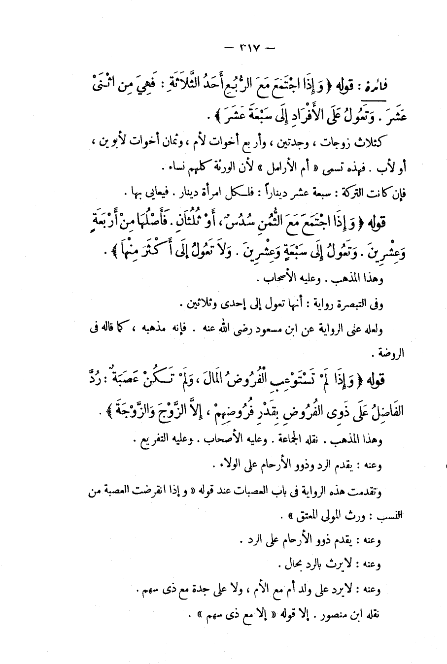 قَوْلُهُ (وَإِذَا اجْتَمَعَ مَعَ الثَّمَنِ سُدُسٌ، أَوْ ثُلُثَانِ. فَأَصْلُهَا مِنْ أَرْبَعَةٍ وَعِشْرِينَ. وَتَعُولُ إلَى سَبْعَةٍ وَعِشْرِينَ. وَلَا تَعُولُ إلَى أَكْثَرَ مِنْهَا) . وَهَذَا الْمَذْهَبُ. وَعَلَيْهِ الْأَصْحَابُ. وَفِي التَّبْصِرَةِ رِوَايَةٌ: أَنَّهَا تَعُولُ إلَى إحْدَى وَثَلَاثِينَ. وَلَعَلَّهُ عَنَى الرِّوَايَةَ عَنْ ابْنِ مَسْعُودٍ - رَضِيَ اللَّهُ عَنْهُ -. فَإِنَّهُ مَذْهَبُهُ، كَمَا قَالَهُ فِي الرَّوْضَةِ.