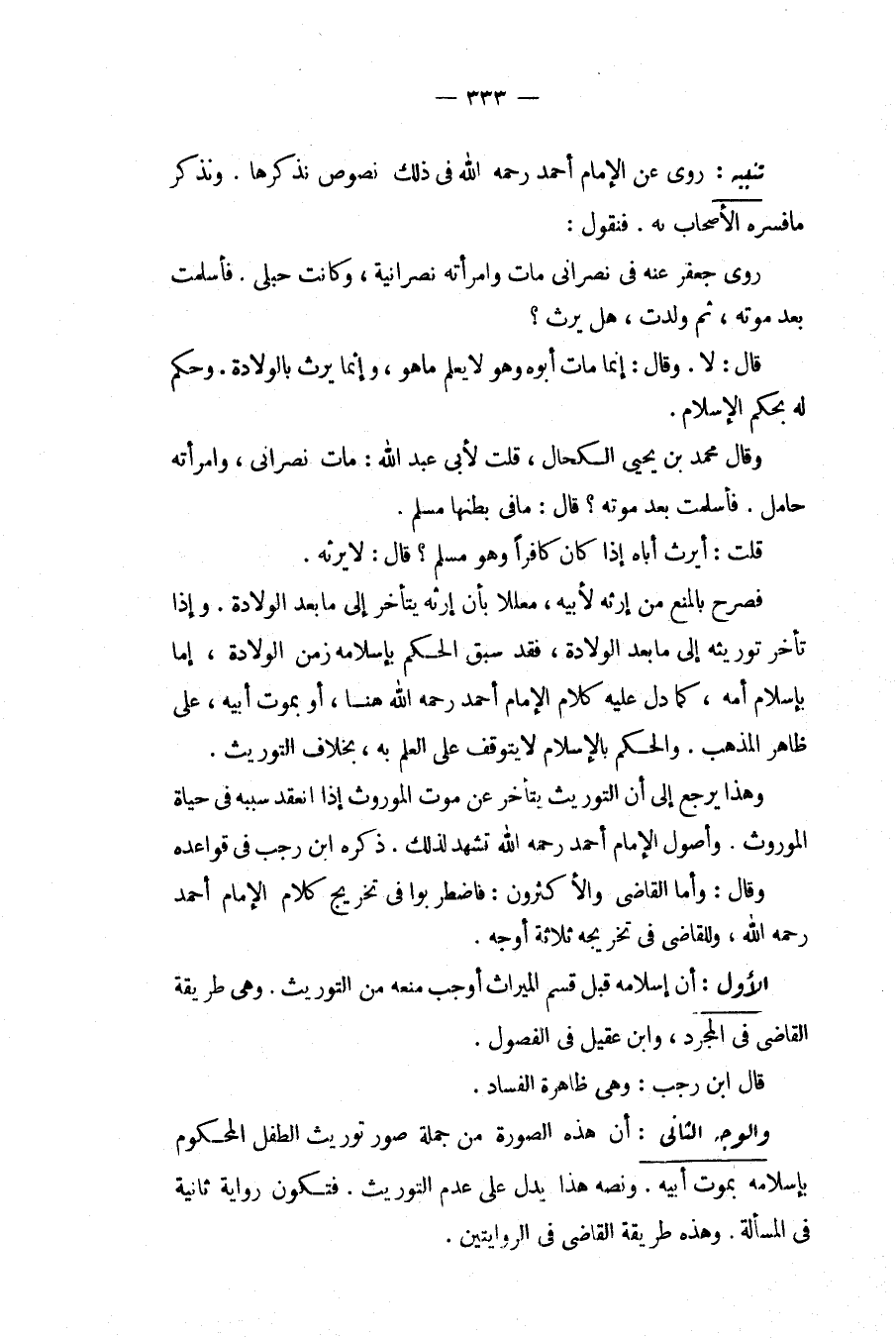تَنْبِيهٌ: رُوِيَ عَنْ الْإِمَامِ أَحْمَدَ - رَحِمَهُ اللَّهُ - فِي ذَلِكَ نُصُوصٌ نَذْكُرُهَا. وَنَذْكُرُ مَا فَسَّرَهُ الْأَصْحَابُ بِهِ. فَنَقُولُ: رَوَى جَعْفَرٌ عَنْهُ فِي نَصْرَانِيٍّ مَاتَ وَامْرَأَتُهُ نَصْرَانِيَّةٌ، وَكَانَتْ حُبْلَى. فَأَسْلَمَتْ بَعْدَ مَوْتِهِ، ثُمَّ وَلَدَتْ، هَلْ يَرِثُ؟ قَالَ: لَا. وَقَالَ: إنَّمَا مَاتَ أَبُوهُ وَهُوَ لَا يَعْلَمُ مَا هُوَ، وَإِنَّمَا يَرِثُ بِالْوِلَادَةِ. وَحُكِمَ لَهُ بِحُكْمِ الْإِسْلَامِ. وَقَالَ مُحَمَّدُ بْنُ يَحْيَى الْكَحَّالُ، قُلْت لِأَبِي عَبْدِ اللَّهِ: مَاتَ نَصْرَانِيٌّ، وَامْرَأَتُهُ حَامِلٌ. فَأَسْلَمَتْ بَعْدَ مَوْتِهِ؟ قَالَ: مَا فِي بَطْنِهَا مُسْلِمٌ. قُلْت: أَيَرِثُ أَبَاهُ إذَا كَانَ كَافِرًا وَهُوَ مُسْلِمٌ؟ قَالَ: لَا يَرِثُهُ. فَصَرَّحَ بِالْمَنْعِ مِنْ إرْثِهِ لِأَبِيهِ، مُعَلِّلًا بِأَنَّ إرْثَهُ يَتَأَخَّرُ إلَى مَا بَعْدَ الْوِلَادَةِ. وَإِذَا تَأَخَّرَ تَوْرِيثُهُ إلَى مَا بَعْدَ الْوِلَادَةِ، فَقَدْ سَبَقَ الْحُكْمُ بِإِسْلَامِهِ زَمَنَ الْوِلَادَةِ، إمَّا بِإِسْلَامِ أُمِّهِ، كَمَا دَلَّ عَلَيْهِ كَلَامُ الْإِمَامِ أَحْمَدَ - رَحِمَهُ اللَّهُ - هُنَا، أَوْ بِمَوْتِ أَبِيهِ، عَلَى ظَاهِرِ الْمَذْهَبِ. وَالْحُكْمُ بِالْإِسْلَامِ لَا يَتَوَقَّفُ عَلَى الْعِلْمِ بِهِ، بِخِلَافِ التَّوْرِيثِ. وَهَذَا يَرْجِعُ إلَى أَنَّ التَّوْرِيثَ يَتَأَخَّرُ عَنْ مَوْتِ الْمَوْرُوثِ إذَا انْعَقَدَ سَبَبُهُ فِي حَيَاةِ الْمَوْرُوثِ وَأُصُولِ الْإِمَامِ أَحْمَدَ - رَحِمَهُ اللَّهُ - تَشْهَدُ لِذَلِكَ. ذَكَرَهُ ابْنُ رَجَبٍ فِي قَوَاعِدِهِ وَقَالَ: وَأَمَّا الْقَاضِي وَالْأَكْثَرُونَ: فَاضْطَرَبُوا فِي تَخْرِيجِ كَلَامِ الْإِمَامِ أَحْمَدَ - رَحِمَهُ اللَّهُ -، وَلِلْقَاضِي فِي تَخْرِيجِهِ ثَلَاثَةُ أَوْجُهٍ. الْأَوَّلُ: أَنَّ إسْلَامَهُ قَبْلَ قَسْمِ الْمِيرَاثِ أَوْجَبَ مَنْعَهُ مِنْ التَّوْرِيثِ. وَهِيَ طَرِيقَةُ الْقَاضِي فِي الْمُجَرَّدِ، وَابْنِ عَقِيلٍ فِي الْفُصُولِ.