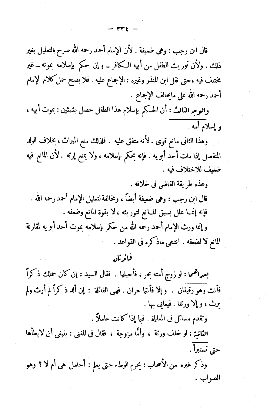 قَالَ ابْنُ رَجَبٍ: وَهِيَ ضَعِيفَةٌ. لِأَنَّ الْإِمَامَ أَحْمَدَ - رَحِمَهُ اللَّهُ - صَرَّحَ بِالتَّعْلِيلِ بِغَيْرِ ذَلِكَ. وَلِأَنَّ تَوْرِيثَ الطِّفْلِ مِنْ أَبِيهِ الْكَافِرِ وَإِنْ حُكِمَ بِإِسْلَامِهِ بِمَوْتِهِ غَيْرُ مُخْتَلَفٍ فِيهِ، حَتَّى نَقَلَ ابْنُ الْمُنْذِرِ وَغَيْرُهُ: الْإِجْمَاعَ عَلَيْهِ. فَلَا يَصِحُّ حَمْلُ كَلَامِ الْإِمَامِ أَحْمَدَ - رَحِمَهُ اللَّهُ - عَلَى مَا يُخَالِفُ الْإِجْمَاعَ. وَالْوَجْهُ الثَّالِثُ: أَنَّ الْحُكْمَ بِإِسْلَامِ هَذَا الطِّفْلِ حَصَلَ بِشَيْئَيْنِ: بِمَوْتِ أَبِيهِ، وَإِسْلَامِ أُمِّهِ. وَهَذَا الثَّانِي مَانِعٌ قَوِيٌّ. لِأَنَّهُ مُتَّفَقٌ عَلَيْهِ. فَلِذَلِكَ مَنَعَ الْمِيرَاثَ، بِخِلَافِ الْوَلَدِ الْمُنْفَصِلِ إذَا مَاتَ أَحَدُ أَبَوَيْهِ. فَإِنَّهُ يُحْكَمُ بِإِسْلَامِهِ، وَلَا يَمْنَعُ إرْثَهُ. لِأَنَّ الْمَانِعَ فِيهِ ضَعِيفٌ لِلِاخْتِلَافِ فِيهِ. وَهَذِهِ طَرِيقَةُ الْقَاضِي فِي خِلَافِهِ. قَالَ ابْنُ رَجَبٍ: وَهِيَ ضَعِيفَةٌ أَيْضًا، وَمُخَالِفَةٌ لِتَعْلِيلِ الْإِمَامِ أَحْمَدَ - رَحِمَهُ اللَّهُ -. فَإِنَّهُ إنَّمَا عُلِّلَ بِسَبْقِ الْمَانِعِ لِتَوْرِيثِهِ، لَا بِقُوَّةِ الْمَانِعِ وَضَعْفِهِ. وَإِنَّمَا وَرَّثَ الْإِمَامُ أَحْمَدُ - رَحِمَهُ اللَّهُ - مَنْ حُكِمَ بِإِسْلَامِهِ بِمَوْتِ أَحَدِ أَبَوَيْهِ لِمُقَارَنَةِ الْمَانِعِ لَا لِضَعْفِهِ. انْتَهَى مَا ذَكَرَهُ فِي الْقَوَاعِدِ.