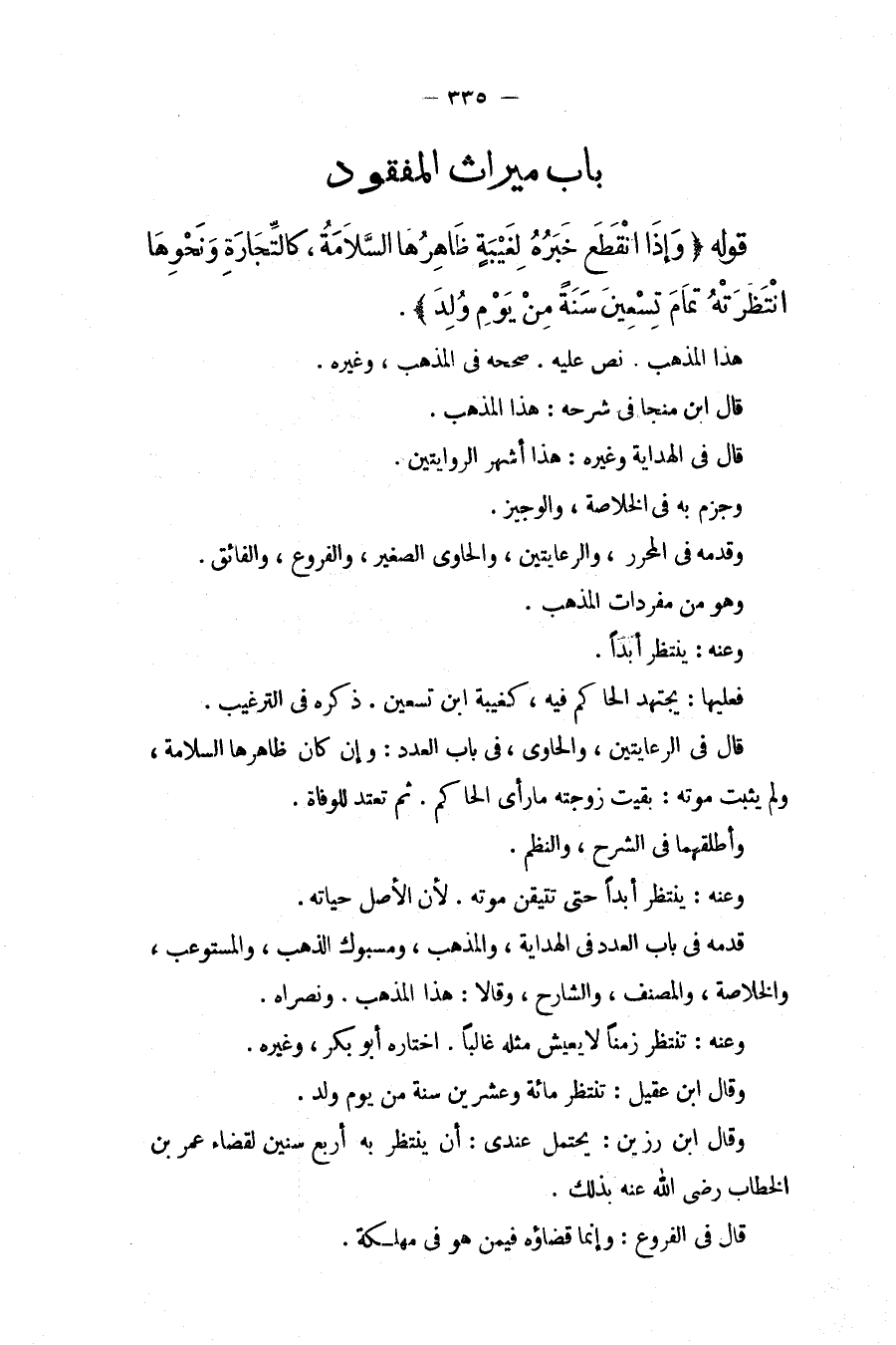 ِ قَوْلُهُ (وَإِذَا انْقَطَعَ خَبَرُهُ لِغَيْبَةٍ ظَاهِرُهَا السَّلَامَةُ، كَالتِّجَارَةِ وَنَحْوِهَا انْتَظَرَتْهُ تَمَامَ تِسْعِينَ سَنَةً مِنْ يَوْمِ وُلِدَ) . هَذَا الْمَذْهَبُ. نَصَّ عَلَيْهِ. صَحَّحَهُ فِي الْمُذْهَبِ، وَغَيْرِهِ. قَالَ ابْنُ مُنَجَّا فِي شَرْحِهِ: هَذَا الْمَذْهَبُ. قَالَ فِي الْهِدَايَةِ وَغَيْرِهِ: هَذَا أَشْهَرُ الرِّوَايَتَيْنِ. وَجَزَمَ بِهِ فِي الْخُلَاصَةِ، وَالْوَجِيزِ. وَقَدَّمَهُ فِي الْمُحَرَّرِ، وَالرِّعَايَتَيْنِ، وَالْحَاوِي الصَّغِيرِ، وَالْفُرُوعِ، وَالْفَائِقِ. وَهُوَ مِنْ مُفْرَدَاتِ الْمُذْهَبِ. وَعَنْهُ: يُنْتَظَرُ أَبَدًا. فَعَلَيْهَا: يَجْتَهِدُ الْحَاكِمُ فِيهِ، كَغَيْبَةِ ابْنِ تِسْعِينَ. ذَكَرَهُ فِي التَّرْغِيبِ. قَالَ فِي الرِّعَايَتَيْنِ، وَالْحَاوِي، فِي بَابِ الْعِدَدِ: وَإِنْ كَانَ ظَاهِرُهَا السَّلَامَةَ، وَلَمْ يَثْبُتْ مَوْتُهُ: بَقِيَتْ زَوْجَتُهُ مَا رَأَى الْحَاكِمُ. ثُمَّ تَعْتَدُّ لِلْوَفَاةِ. وَأَطْلَقَهُمَا فِي الشَّرْحِ، وَالنَّظَرِ. وَعَنْهُ: يُنْتَظَرُ أَبَدًا حَتَّى تَتَيَقَّنَ مَوْتَهُ. لِأَنَّ الْأَصْلَ حَيَاتُهُ. قَدَّمَهُ فِي بَابِ الْعِدَدِ فِي الْهِدَايَةِ، وَالْمُذْهَبِ، وَمَسْبُوكِ الذَّهَبِ، وَالْمُسْتَوْعِبِ، وَالْخُلَاصَةِ، وَالْمُصَنِّفِ، وَالشَّارِحِ، وَقَالَا: هَذَا الْمَذْهَبُ. وَنَصَرَاهُ. وَعَنْهُ: تَنْتَظِرُ زَمَنًا لَا يَعِيشُ مِثْلَهُ غَالِبًا. اخْتَارَهُ أَبُو بَكْرٍ، وَغَيْرُهُ. وَقَالَ ابْنُ عَقِيلٍ: تَنْتَظِرُ مِائَةً وَعِشْرِينَ سَنَةً مِنْ يَوْمِ وُلِدَ. وَقَالَ ابْنُ رَزِينٍ: يَحْتَمِلُ عِنْدِي: أَنْ يُنْتَظَرَ بِهِ أَرْبَعُ سِنِينَ لِقَضَاءِ عُمَرَ بْنِ الْخَطَّابِ - رَضِيَ اللَّهُ عَنْهُ - بِذَلِكَ. قَالَ فِي الْفُرُوعِ: وَإِنَّمَا قَضَاؤُهُ فِيمَنْ هُوَ فِي مُهْلِكَةٍ.