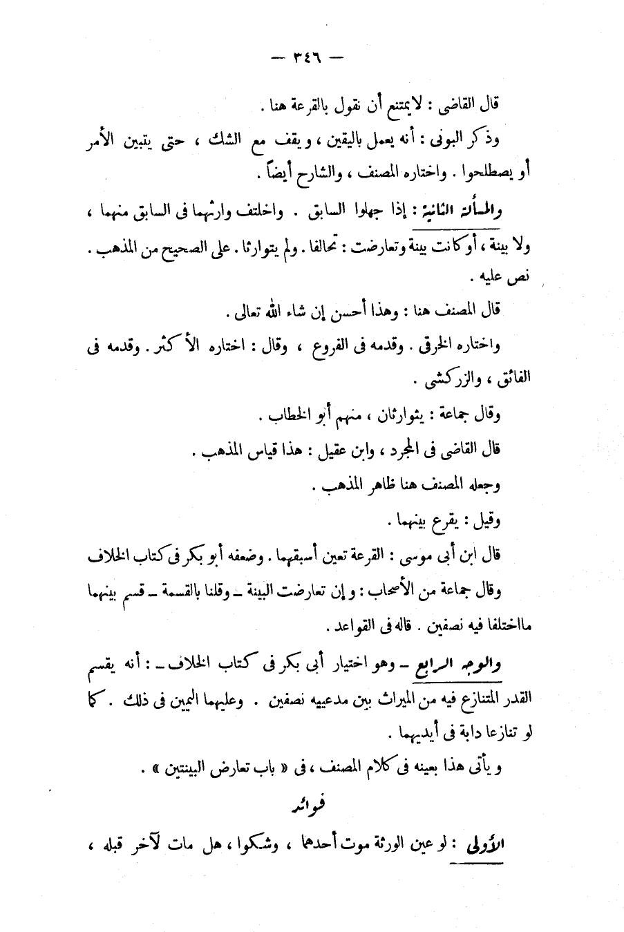 قَالَ الْقَاضِي: لَا يَمْتَنِعُ أَنْ نَقُولَ بِالْقُرْعَةِ هُنَا. وَذَكَرَ الْبَوْنِيُّ: أَنَّهُ يُعْمَلُ بِالْيَقِينِ، وَيَقِفُ مَعَ الشَّكِّ، حَتَّى يَتَبَيَّنَ الْأَمْرُ أَوْ يَصْطَلِحُوا. وَاخْتَارَهُ الْمُصَنِّفُ، وَالشَّارِحُ أَيْضًا. وَالْمَسْأَلَةُ الثَّانِيَةُ: إذَا جَهِلُوا السَّابِقَ. وَاخْتَلَفَ وَارِثُهُمَا فِي السَّابِقِ مِنْهُمَا، وَلَا بَيِّنَةَ، أَوْ كَانَتْ بَيِّنَةٌ وَتَعَارَضَتْ: تَحَالَفَا. وَلَمْ يَتَوَارَثَا. عَلَى الصَّحِيحِ مِنْ الْمَذْهَبِ. نَصَّ عَلَيْهِ. قَالَ الْمُصَنِّفُ هُنَا: وَهَذَا أَحْسَنُ إنْ شَاءَ اللَّهُ تَعَالَى. وَاخْتَارَهُ الْخِرَقِيُّ. وَقَدَّمَهُ فِي الْفُرُوعِ، وَقَالَ: اخْتَارَهُ الْأَكْثَرُ. وَقَدَّمَهُ فِي الْفَائِقِ، وَالزَّرْكَشِيِّ. وَقَالَ جَمَاعَةٌ: يَتَوَارَثَانِ، مِنْهُمْ أَبُو الْخَطَّابِ. قَالَ الْقَاضِي فِي الْمُجَرَّدِ، وَابْنُ عَقِيلٍ: هَذَا قِيَاسُ الْمَذْهَبِ. وَجَعَلَهُ الْمُصَنِّفُ هُنَا ظَاهِرَ الْمَذْهَبِ. وَقِيلَ: يُقْرَعُ بَيْنَهُمَا. قَالَ ابْنُ أَبِي مُوسَى: الْقُرْعَةُ تُعَيِّنُ أَسْبَقَهُمَا. وَضَعَّفَهُ أَبُو بَكْرٍ فِي كِتَابِ الْخِلَافِ وَقَالَ جَمَاعَةٌ مِنْ الْأَصْحَابِ: وَإِنْ تَعَارَضَتْ الْبَيِّنَةُ وَقُلْنَا بِالْقِسْمَةِ قُسِمَ بَيْنَهُمَا مَا اخْتَلَفَا فِيهِ نِصْفَيْنِ. قَالَهُ فِي الْقَوَاعِدِ. وَالْوَجْهُ الرَّابِعُ وَهُوَ اخْتِيَارُ أَبِي بَكْرٍ فِي كِتَابِ الْخِلَافِ: أَنَّهُ يُقْسَمُ الْقَدْرُ الْمُتَنَازَعُ فِيهِ مِنْ الْمِيرَاثِ بَيْنَ مُدَّعِيَيْهِ نِصْفَيْنِ. وَعَلَيْهِمَا الْيَمِينُ فِي ذَلِكَ. كَمَا لَوْ تَنَازَعَا دَابَّةً فِي أَيْدِيهِمَا. وَيَأْتِي هَذَا بِعَيْنِهِ فِي كَلَامِ الْمُصَنِّفِ، فِي " بَابِ تَعَارُضِ الْبَيِّنَتَيْنِ ".