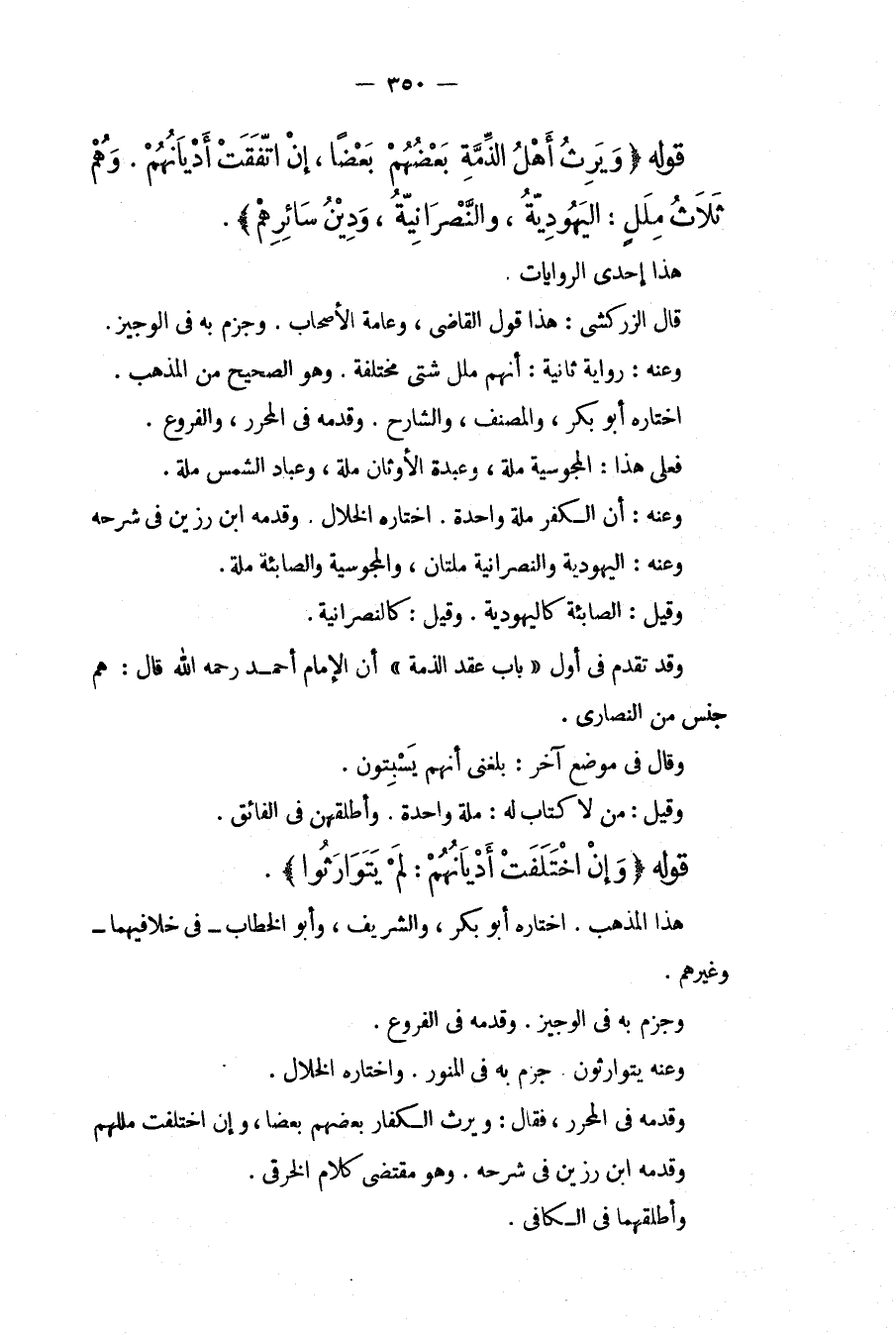 قَوْلُهُ (وَيَرِثُ أَهْلُ الذِّمَّةِ بَعْضُهُمْ بَعْضًا، إنْ اتَّفَقَتْ أَدْيَانُهُمْ. وَهُمْ ثَلَاثُ مِلَلٍ: الْيَهُودِيَّةُ، وَالنَّصْرَانِيَّةُ، وَدِينُ سَائِرِهِمْ) . هَذَا إحْدَى الرِّوَايَاتِ قَالَ الزَّرْكَشِيُّ: هَذَا قَوْلُ الْقَاضِي، وَعَامَّةِ الْأَصْحَابِ. وَجَزَمَ بِهِ فِي الْوَجِيزِ. وَعَنْهُ: رِوَايَةٌ ثَانِيَةٌ: أَنَّهُمْ مِلَلٌ شَتَّى مُخْتَلِفَةٌ. وَهُوَ الصَّحِيحُ مِنْ الْمَذْهَبِ. اخْتَارَهُ أَبُو بَكْرٍ، وَالْمُصَنِّفُ، وَالشَّارِحُ. وَقَدَّمَهُ فِي الْمُحَرَّرِ، وَالْفُرُوعِ. فَعَلَى هَذَا: الْمَجُوسِيَّةُ مِلَّةٌ، وَعَبَدَةُ الْأَوْثَانِ مِلَّةٌ، وَعُبَّادُ الشَّمْسِ مِلَّةٌ. وَعَنْهُ: أَنَّ الْكُفْرَ مِلَّةٌ وَاحِدَةٌ. اخْتَارَهُ الْخَلَّالُ. وَقَدَّمَهُ ابْنُ رَزِينٍ فِي شَرْحِهِ وَعَنْهُ: الْيَهُودِيَّةُ وَالنَّصْرَانِيَّةُ مِلَّتَانِ، وَالْمَجُوسِيَّةُ وَالصَّابِئَةُ مِلَّةٌ. وَقِيلَ: الصَّابِئَةُ كَالْيَهُودِيَّةِ. وَقِيلَ: كَالنَّصْرَانِيَّةِ. وَقَدْ تَقَدَّمَ فِي أَوَّلِ " بَابِ عَقْدِ الذِّمَّةِ " أَنَّ الْإِمَامَ أَحْمَدَ - رَحِمَهُ اللَّهُ - قَالَ: هُمْ جِنْسٌ مِنْ النَّصَارَى. وَقَالَ فِي مَوْضِعٍ آخَرَ: بَلَغَنِي أَنَّهُمْ يَسْبِتُونَ. وَقِيلَ: مَنْ لَا كِتَابَ لَهُ: مِلَّةٌ وَاحِدَةٌ. وَأَطْلَقَهُنَّ فِي الْفَائِقِ. قَوْلُهُ (وَإِنْ اخْتَلَفَتْ أَدْيَانُهُمْ: لَمْ يَتَوَارَثُوا) . هَذَا الْمَذْهَبُ. اخْتَارَهُ أَبُو بَكْرٍ، وَالشَّرِيفُ، وَأَبُو الْخَطَّابِ فِي خِلَافَيْهِمَا وَغَيْرِهِمْ. وَجَزَمَ بِهِ فِي الْوَجِيزِ. وَقَدَّمَهُ فِي الْفُرُوعِ. وَعَنْهُ يَتَوَارَثُونَ جَزَمَ بِهِ فِي الْمُنَوِّرِ. وَاخْتَارَهُ الْخَلَّالُ. وَقَدَّمَهُ فِي الْمُحَرَّرِ، فَقَالَ: وَيَرِثُ الْكُفَّارُ بَعْضُهُمْ بَعْضًا، وَإِنْ اخْتَلَفَتْ مِلَلُهُمْ وَقَدَّمَهُ ابْنُ رَزِينٍ فِي شَرْحِهِ. وَهُوَ مُقْتَضَى كَلَامِ الْخِرَقِيِّ. وَأَطْلَقَهُمَا فِي الْكَافِي.