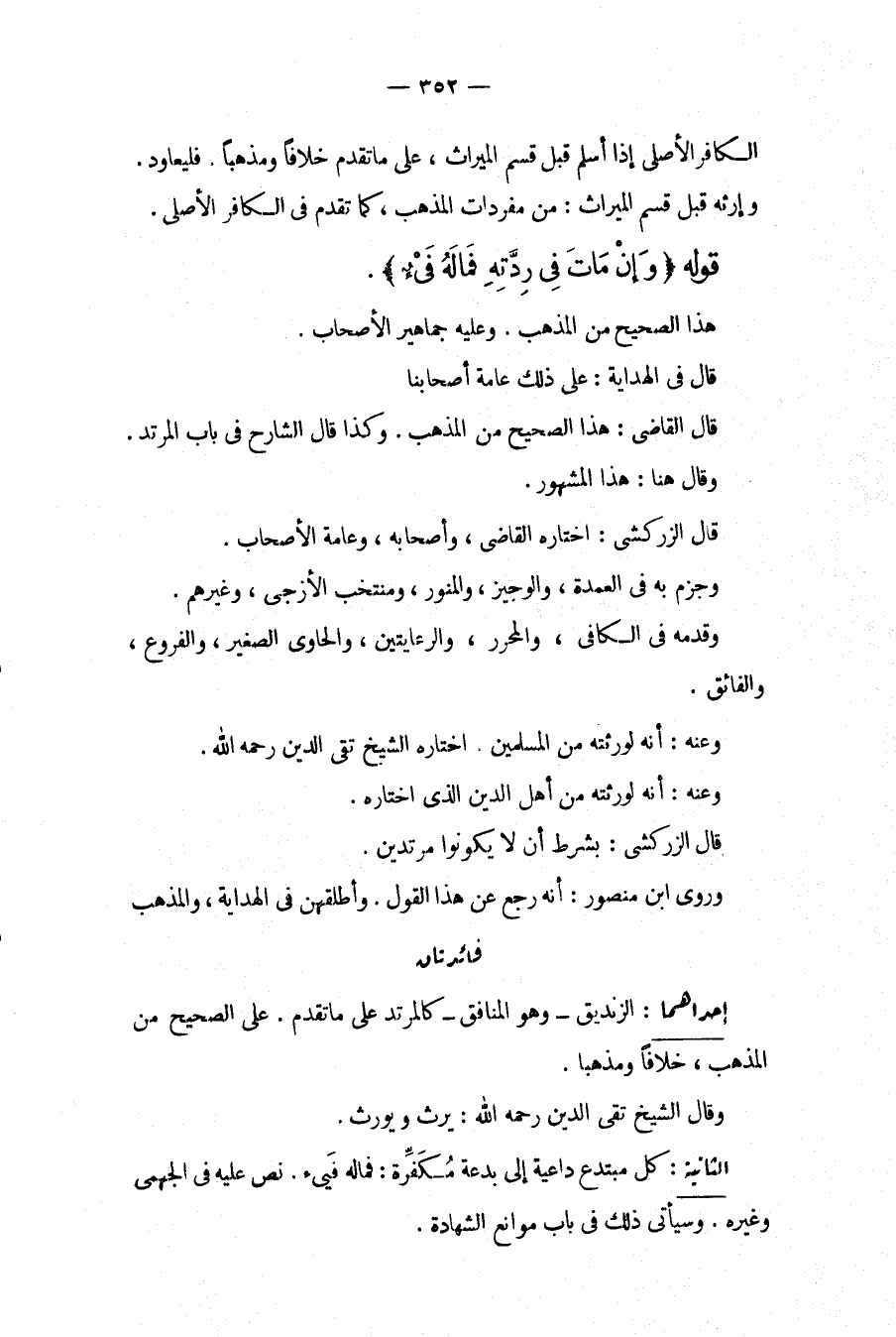 الْكَافِرِ الْأَصْلِيِّ إذَا أَسْلَمَ قَبْلَ قَسْمِ الْمِيرَاثِ، عَلَى مَا تَقَدَّمَ خِلَافًا وَمَذْهَبًا. فَلْيُعَاوَدْ وَإِرْثُهُ قَبْلَ قَسْمِ الْمِيرَاثِ: مِنْ مُفْرَدَاتِ الْمَذْهَبِ، كَمَا تَقَدَّمَ فِي الْكَافِرِ الْأَصْلِيِّ. قَوْلُهُ (وَإِنْ مَاتَ فِي رِدَّتِهِ فَمَالُهُ فَيْءٌ) . هَذَا الصَّحِيحُ مِنْ الْمَذْهَبِ. وَعَلَيْهِ جَمَاهِيرُ الْأَصْحَابِ. قَالَ فِي الْهِدَايَةِ: عَلَى ذَلِكَ عَامَّةُ أَصْحَابِنَا قَالَ الْقَاضِي: هَذَا الصَّحِيحُ مِنْ الْمَذْهَبِ. وَكَذَا قَالَ الشَّارِحُ فِي بَابِ الْمُرْتَدِّ. وَقَالَ هُنَا: هَذَا الْمَشْهُورُ. قَالَ الزَّرْكَشِيُّ: اخْتَارَهُ الْقَاضِي، وَأَصْحَابُهُ، وَعَامَّةُ الْأَصْحَابِ. وَجَزَمَ بِهِ فِي الْعُمْدَةِ، وَالْوَجِيزِ، وَالْمُنَوِّرِ، وَمُنْتَخَبِ الْأَزَجِيِّ، وَغَيْرِهِمْ. وَقَدَّمَهُ فِي الْكَافِي، وَالْمُحَرَّرِ، وَالرِّعَايَتَيْنِ، وَالْحَاوِي الصَّغِيرِ، وَالْفُرُوعِ، وَالْفَائِقِ. وَعَنْهُ: أَنَّهُ لِوَرَثَتِهِ مِنْ الْمُسْلِمِينَ اخْتَارَهُ الشَّيْخُ تَقِيُّ الدِّينِ - رَحِمَهُ اللَّهُ -. وَعَنْهُ: أَنَّهُ لِوَرَثَتِهِ مِنْ أَهْلِ الدِّينِ الَّذِي اخْتَارَهُ. قَالَ الزَّرْكَشِيُّ: بِشَرْطِ أَنْ لَا يَكُونُوا مُرْتَدِّينَ. وَرَوَى ابْنُ مَنْصُورٍ: أَنَّهُ رَجَعَ عَنْ هَذَا الْقَوْلِ. وَأَطْلَقَهُنَّ الْهِدَايَةُ، وَالْمُذْهَبُ فَائِدَتَانِ إحْدَاهُمَا: الزِّنْدِيقُ وَهُوَ الْمُنَافِقُ كَالْمُرْتَدِّ عَلَى مَا تَقَدَّمَ. عَلَى الصَّحِيحِ مِنْ الْمَذْهَبِ، خِلَافًا وَمَذْهَبًا. وَقَالَ الشَّيْخُ تَقِيُّ الدِّينِ - رَحِمَهُ اللَّهُ -: يَرِثُ وَيُورَثُ.