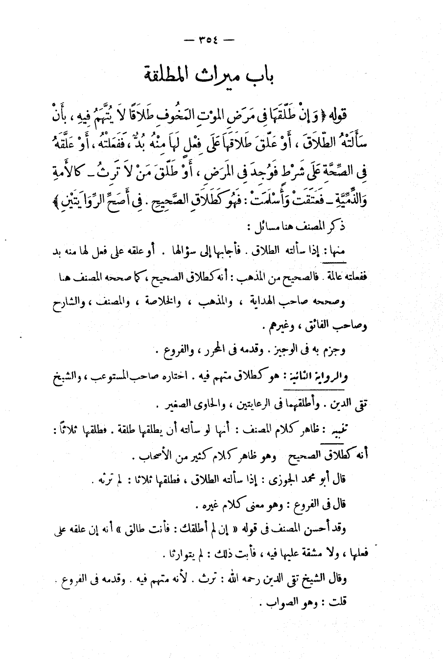 بَابُ مِيرَاثِ الْمُطَلَّقَةِ قَوْلُهُ (وَإِنْ طَلَّقَهَا فِي مَرَضِ الْمَوْتِ الْمَخُوفِ طَلَاقًا لَا يُتَّهَمُ فِيهِ، بِأَنْ سَأَلَتْهُ الطَّلَاقَ، أَوْ عَلَّقَ طَلَاقَهَا عَلَى فِعْلٍ لَهَا مِنْهُ بُدٌّ، فَفَعَلَتْهُ، أَوْ عَلَّقَهُ فِي الصِّحَّةِ عَلَى شَرْطٍ فَوُجِدَ فِي الْمَرَضِ، أَوْ طَلَّقَ مَنْ لَا تَرِثُ كَالْأَمَةِ وَالذِّمِّيَّةِ فَعَتَقَتْ وَأَسْلَمَتْ: فَهُوَ كَالطَّلَاقِ الصَّحِيحِ. فِي أَصَحِّ الرِّوَايَتَيْنِ) ذَكَرَ الْمُصَنِّفُ هُنَا مَسَائِلَ: مِنْهَا: إذَا سَأَلَتْهُ الطَّلَاقَ. فَأَجَابَهَا إلَى سُؤَالِهَا. أَوْ عَلَّقَهُ عَلَى فِعْلٍ لَهَا مِنْهُ بُدٌّ فَفَعَلَتْهُ عَالِمَةً فَالصَّحِيحُ مِنْ الْمَذْهَبِ: أَنَّهُ كَطَلَاقِ الصَّحِيحِ، كَمَا صَحَّحَهُ الْمُصَنِّفُ هُنَا. وَصَحَّحَهُ صَاحِبُ الْهِدَايَةِ، وَالْمُذْهَبِ، وَالْخُلَاصَةِ، وَالْمُصَنِّفُ، وَالشَّارِحُ وَصَاحِبُ الْفَائِقِ، وَغَيْرُهُمْ. وَجَزَمَ بِهِ فِي الْوَجِيزِ. وَقَدَّمَهُ فِي الْمُحَرَّرِ، وَالْفُرُوعِ. وَالرِّوَايَةُ الثَّانِيَةُ: هُوَ كَطَلَاقٍ مُتَّهَمٍ فِيهِ. اخْتَارَهُ صَاحِبُ الْمُسْتَوْعِبِ، وَالشَّيْخُ تَقِيُّ الدِّينِ. وَأَطْلَقَهُمَا فِي الرِّعَايَتَيْنِ، وَالْحَاوِي الصَّغِيرِ.