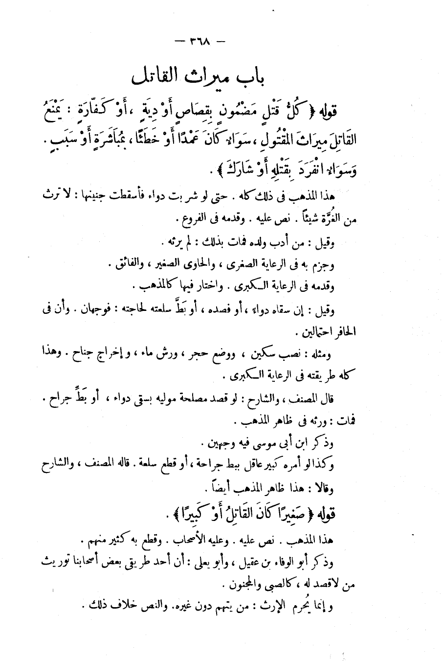 قَوْلُهُ (كُلُّ قَتْلٍ مَضْمُونٍ بِقِصَاصٍ أَوْ دِيَةٍ، أَوْ كَفَّارَةٍ: يَمْنَعُ الْقَاتِلَ مِيرَاثَ الْمَقْتُولِ، سَوَاءٌ كَانَ عَمْدًا أَوْ خَطَأً، بِمُبَاشَرَةٍ أَوْ سَبَبٍ. وَسَوَاءٌ انْفَرَدَ بِقَتْلِهِ أَوْ شَارَكَ) . هَذَا الْمَذْهَبُ فِي ذَلِكَ كُلِّهِ. حَتَّى لَوْ شَرِبَتْ دَوَاءً فَأَسْقَطَتْ جَنِينَهَا: لَا تَرِثُ مِنْ الْغُرَّةِ شَيْئًا. نَصَّ عَلَيْهِ. وَقَدَّمَهُ فِي الْفُرُوعِ. وَقِيلَ: مَنْ أَدَّبَ وَلَدَهُ فَمَاتَ بِذَلِكَ: لَمْ يَرِثْهُ وَجَزَمَ بِهِ فِي الرِّعَايَةِ الصُّغْرَى، وَالْحَاوِي الصَّغِيرِ، وَالْفَائِقِ. وَقَدَّمَهُ فِي الرِّعَايَةِ الْكُبْرَى. وَاخْتَارَ فِيهَا كَالْمُذْهَبِ. وَقِيلَ: إنْ سَقَاهُ دَوَاءً، أَوْ فَصَدَهُ، أَوْ بَطَّ سِلْعَتَهُ لِحَاجَتِهِ: فَوَجْهَانِ. وَأَنَّ فِي الْحَافِرِ احْتِمَالَيْنِ. وَمِثْلُهُ: نَصْبُ سِكِّينٍ، وَوَضْعُ حَجَرٍ، وَرَشُّ مَاءٍ، وَإِخْرَاجُ جَنَاحٍ. وَهَذَا كُلُّهُ طَرِيقَتُهُ فِي الرِّعَايَةِ الْكُبْرَى. قَالَ الْمُصَنِّفُ، وَالشَّارِحُ: لَوْ قَصَدَ مَصْلَحَةَ مُوَلِّيهِ بِسَقْيِ دَوَاءٍ، أَوْ بَطِّ جِرَاحٍ. فَمَاتَ: وَرِثَهُ فِي ظَاهِرِ الْمَذْهَبِ. وَذَكَرَ ابْنُ أَبِي مُوسَى فِيهِ وَجْهَيْنِ. وَكَذَا لَوْ أَمَرَهُ كَبِيرٌ عَاقِلٌ بِبَطِّ جِرَاحَةٍ، أَوْ قَطْعِ سِلْعَةٍ. قَالَهُ الْمُصَنِّفُ، وَالشَّارِحُ وَقَالَا: هَذَا ظَاهِرُ الْمَذْهَبِ أَيْضًا.